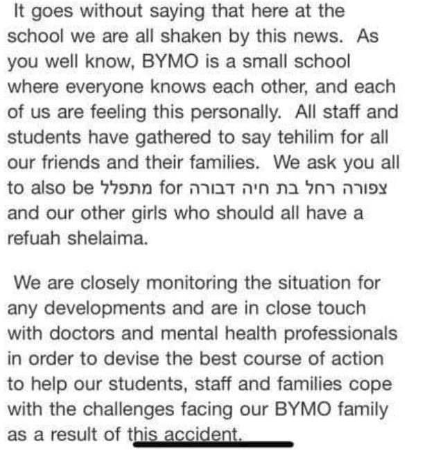 My daughter attends this school, and the girl that underwent surgery is in her class. I received the email shown above before it was posted here. Shocked and stunned. May all of the girls have a refuah shleimah, and may we only hear of simchas.