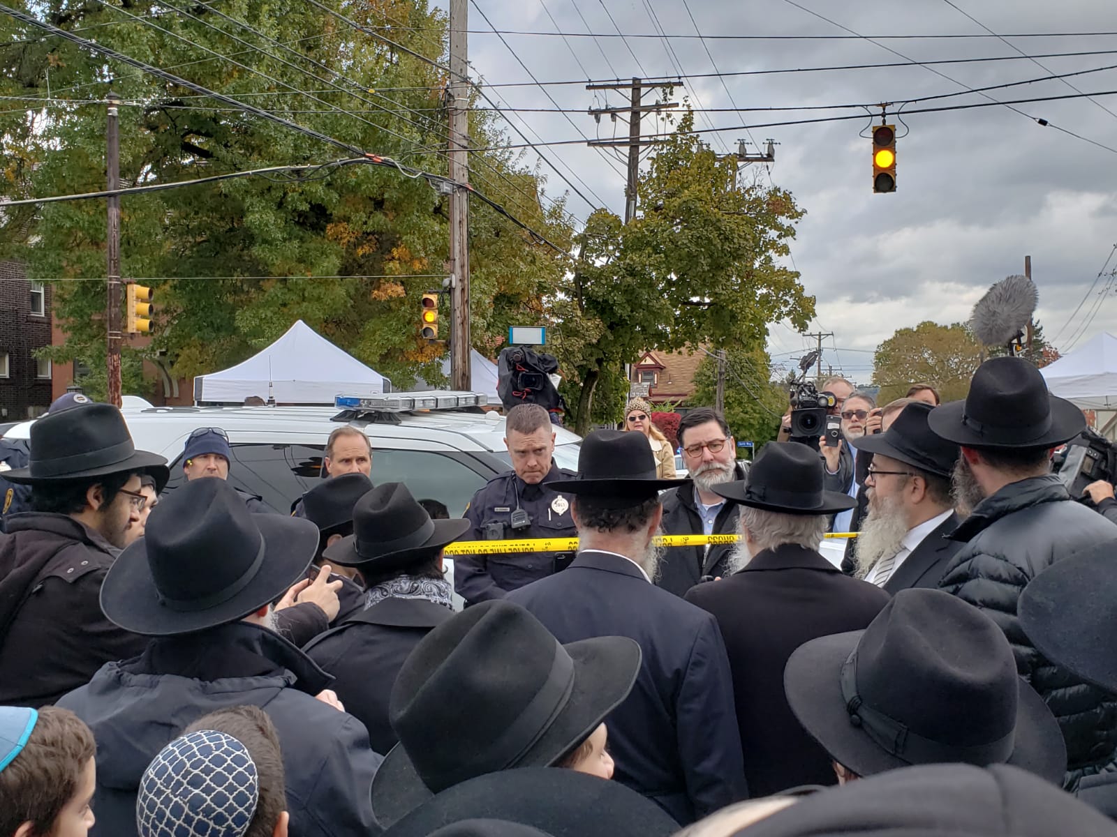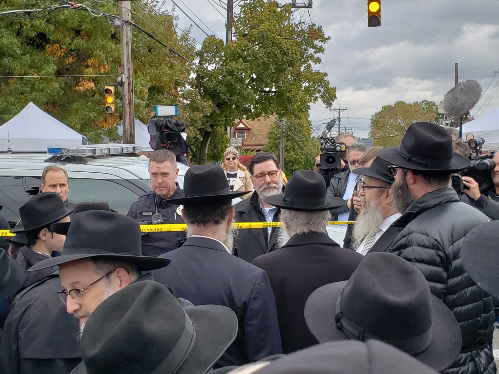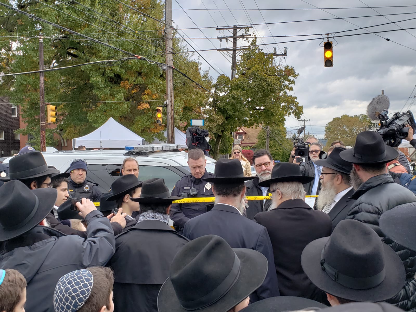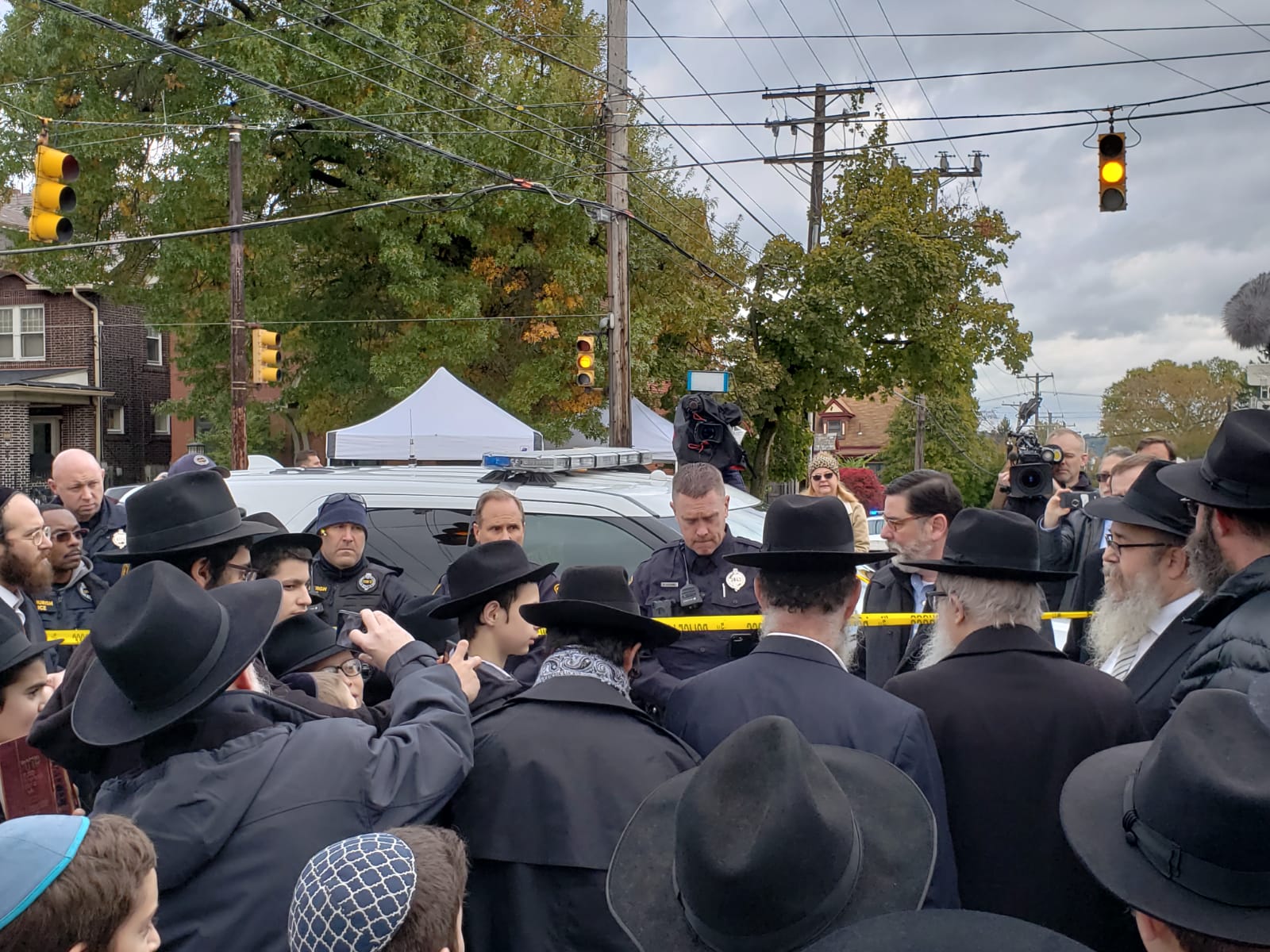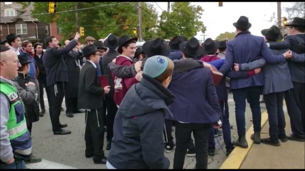 Dozens of Lubavitcher Yeshiva Bochrim, along with their Rabbeim gathered outside the Tree of Life Synagogue in Pittsburgh on Monday afternoon, where 11 Jews were murdered in a Shabbos morning shooting attack.