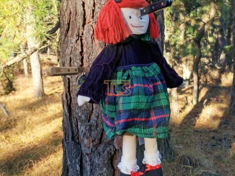 TLS first reported the discovery at around 9:00 AM, located in the wooded area off Swarthmore Avenue, near the Toras Menachem elementary boys school. The stuffed girl rag doll had a butcher knife stuck into its head. A second knife was stuck in the tree.