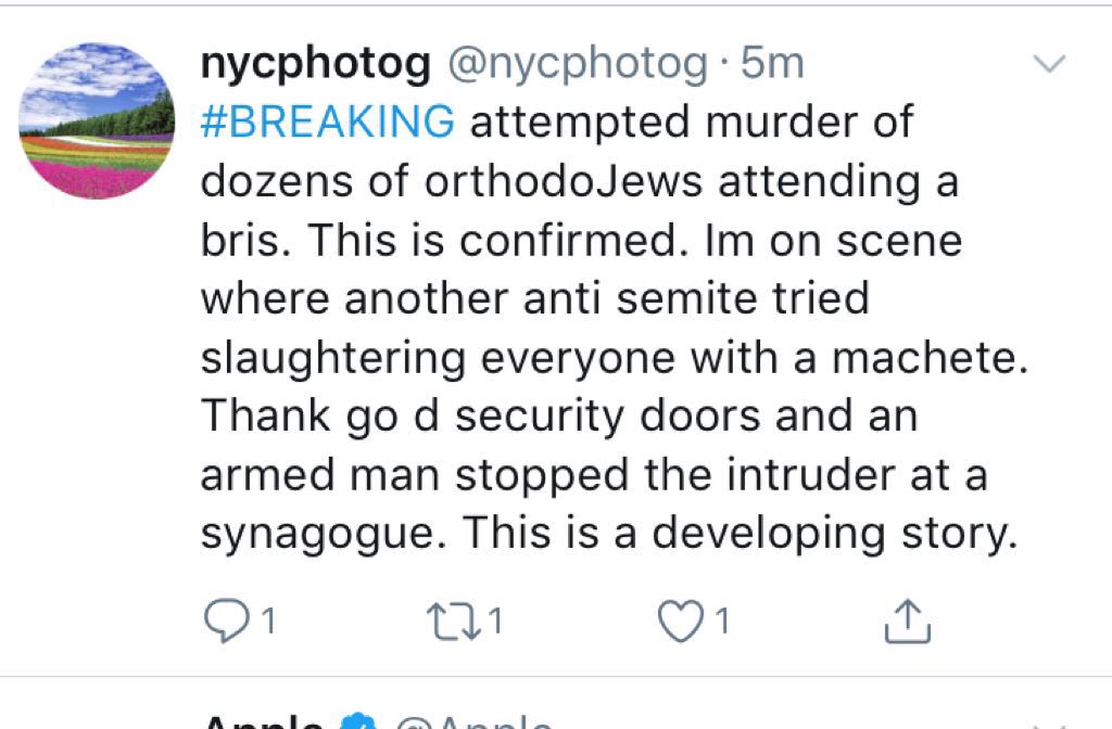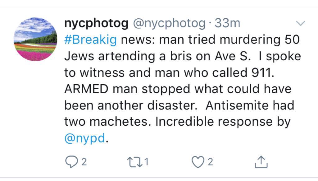 The same irresponsible reporter continued his tweets, causing unnecessary panic in the community, “#Breakig news: man tried murdering 50 Jews artending a Bris on Ave S. I spoke to witness and a man who called 911. ARMED man stopped what could have been another disaster. Antisemite had two machetes. Incredible response by @nypd.”