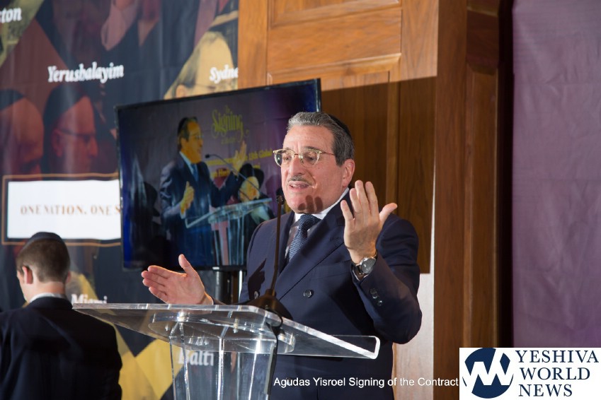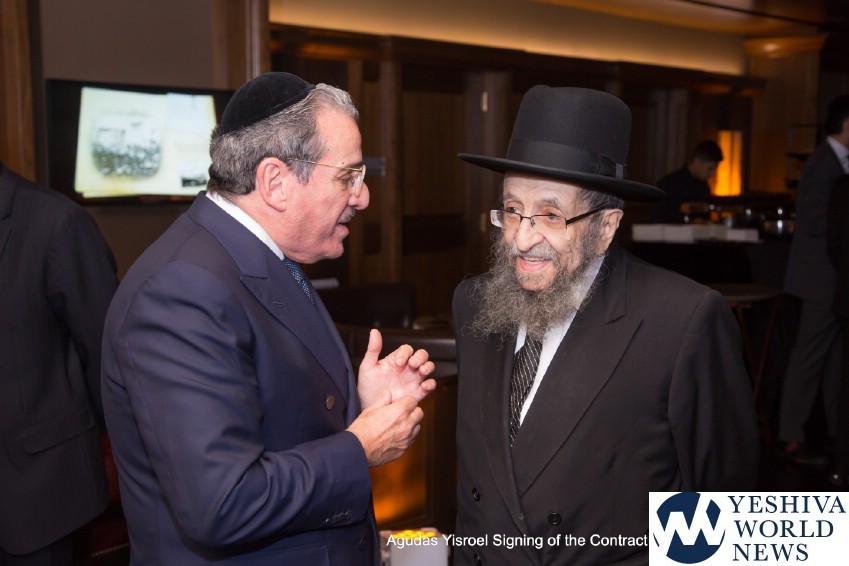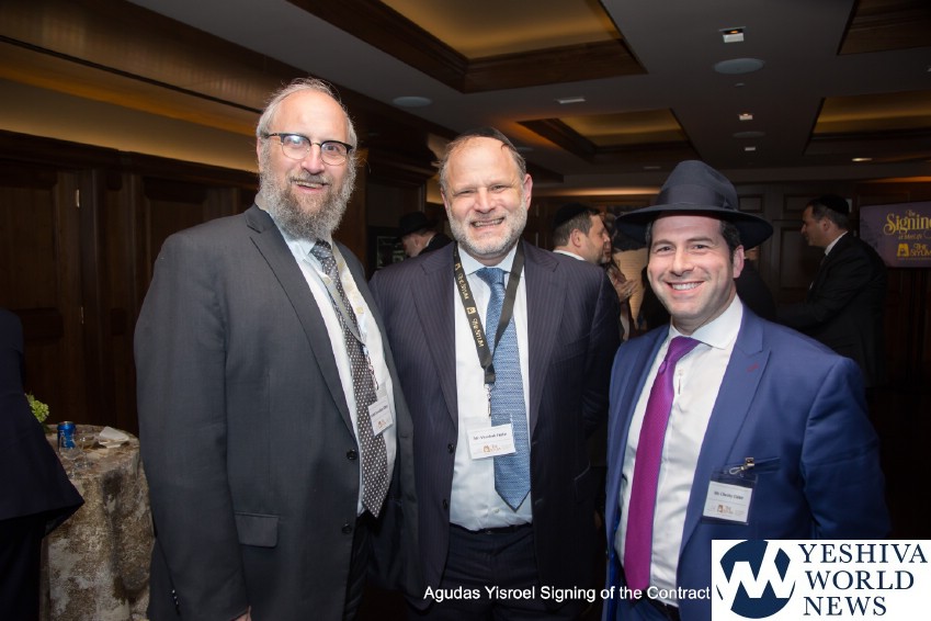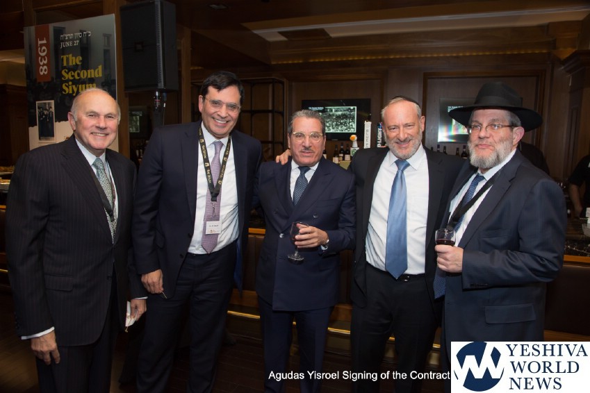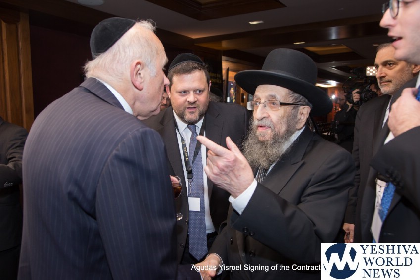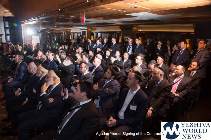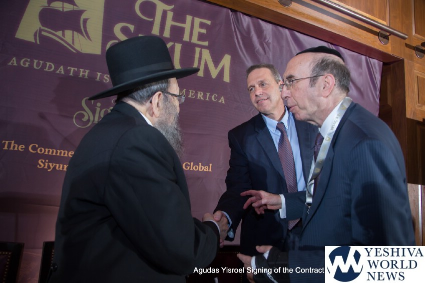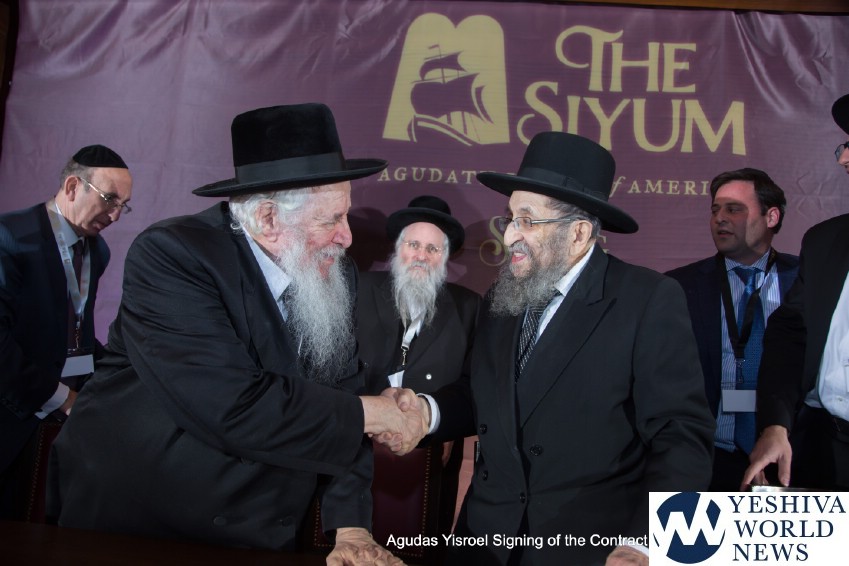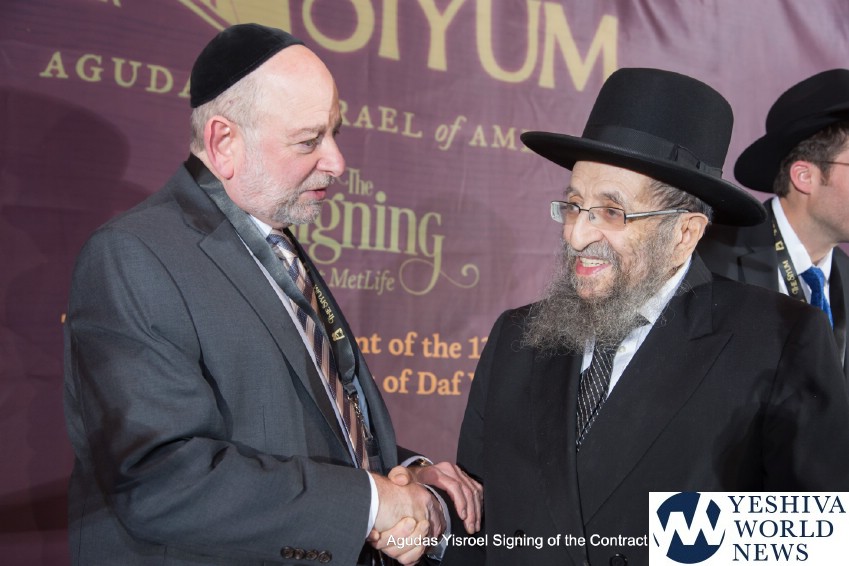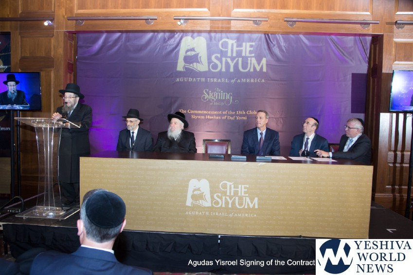 The atmosphere in the air was electric when the contract for The Siyum was signed by the Novominsker Rebbe and Rav Kamenetsky, on behalf of the Moetzes Gedolei HaTorah and the Agudah, and Mr. VanDeveen, on behalf of MetLife Stadium. Participants erupted in spontaneous song, celebrating the jubilant moment that signified that the Daf Yomi program was entering its long awaited final stretch. The emotional undercurrent in the room was further amplified when Agudah board of trustees member Rivie Schwebel took to the microphone, singing Rav Meir Shapiro’s unforgettable composition Ashrei Adam Oz Lo Voch, a heartwarming tribute to the founder of the Daf Yomi.