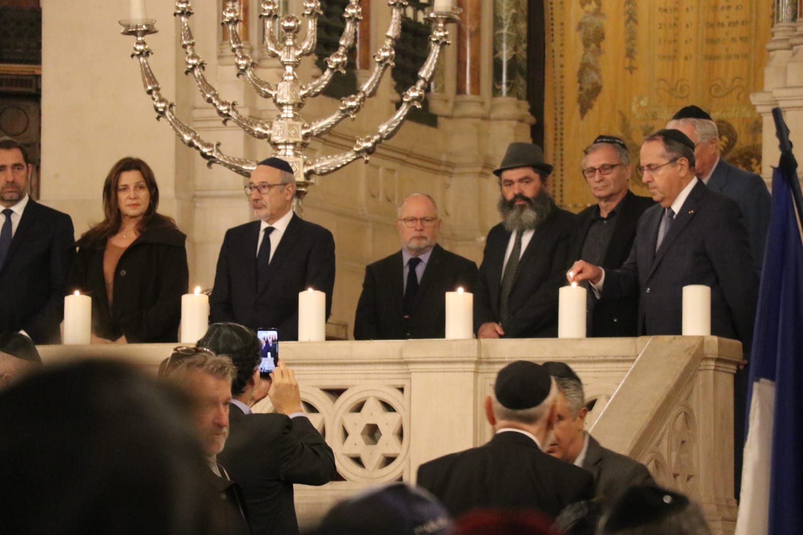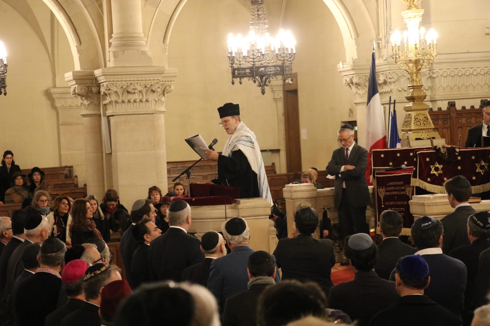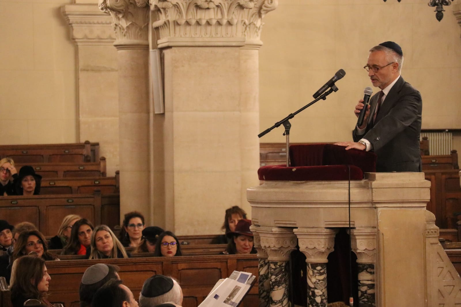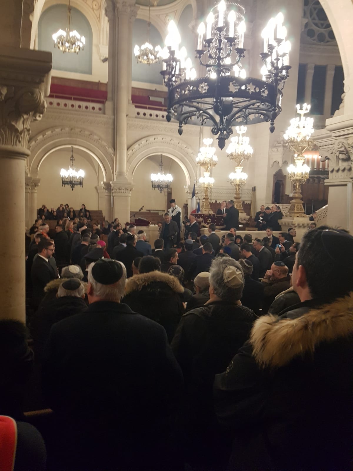 The crowd was addressed by Chief Rabbi of Paris Michel Gugenheim, Chief Rabbi of France Haim Korsia, synagogue President Jacques Canet, and Joel Mergui, who serves as president of the Consistoire organization that provides religious services to French Jews.