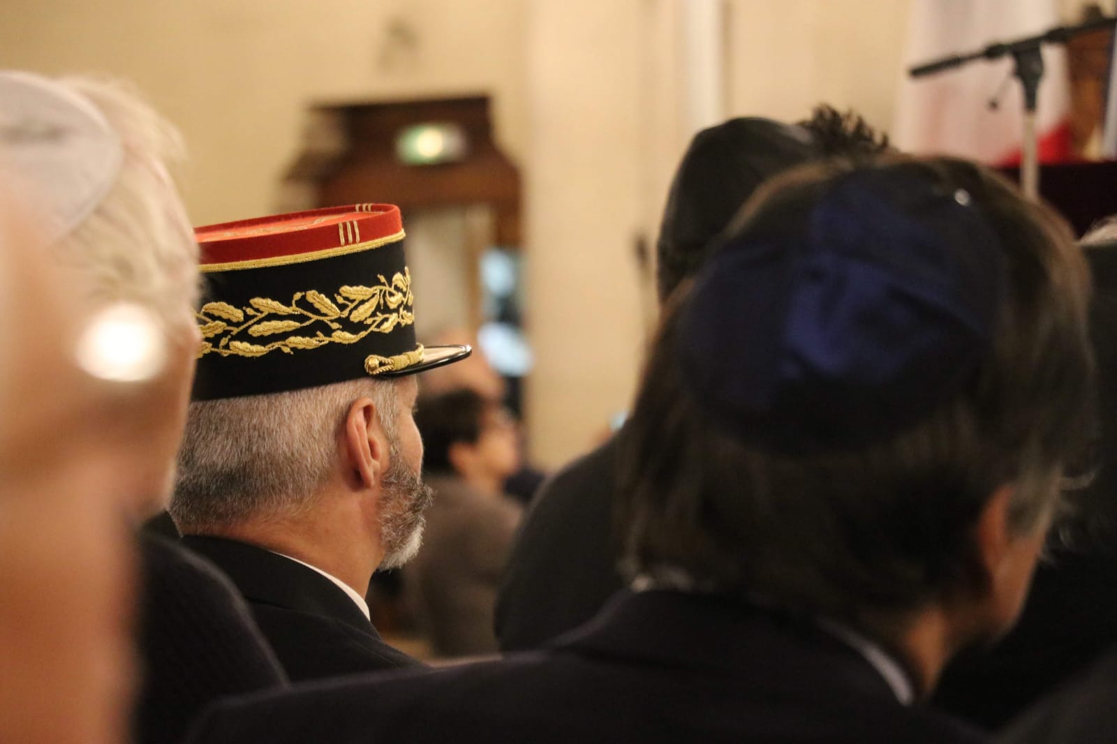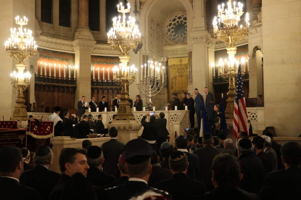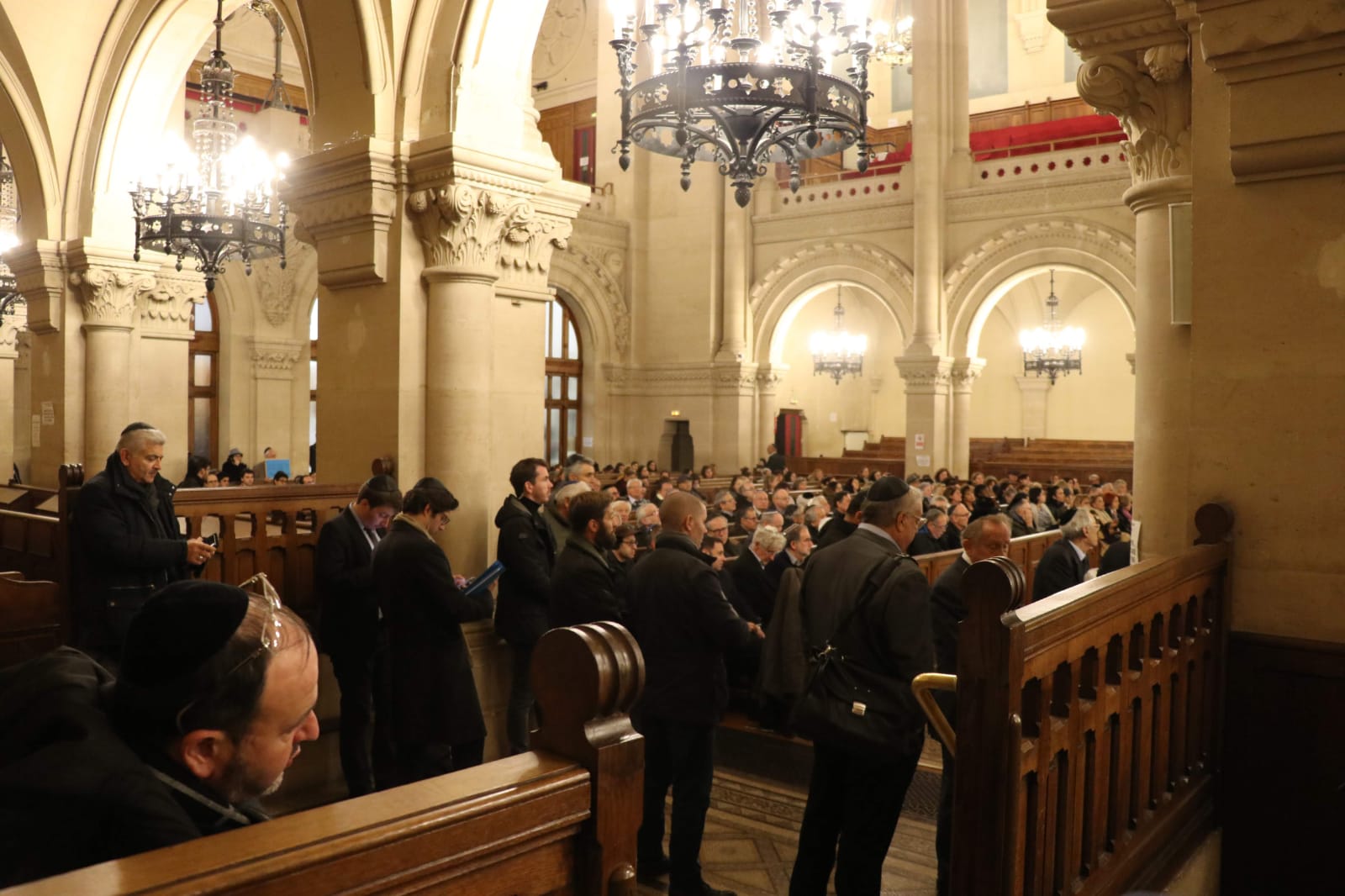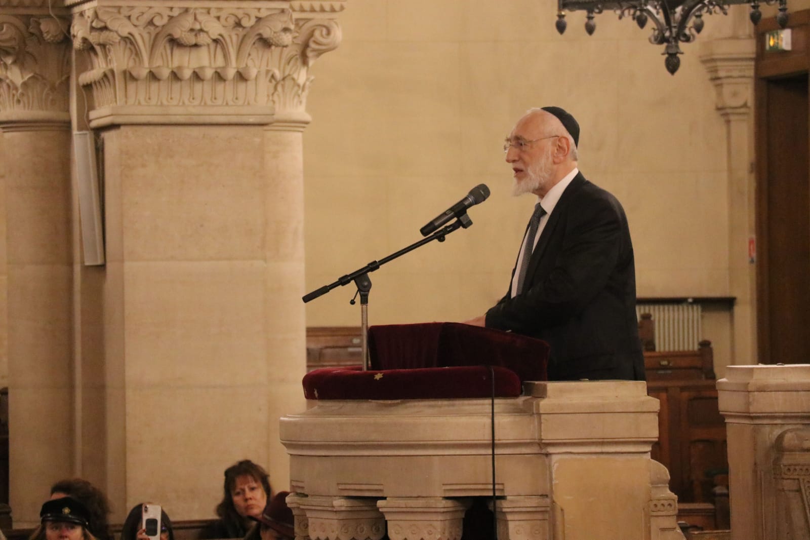 The crowd was addressed by Chief Rabbi of Paris Michel Gugenheim, Chief Rabbi of France Haim Korsia, synagogue President Jacques Canet, and Joel Mergui, who serves as president of the Consistoire organization that provides religious services to French Jews.