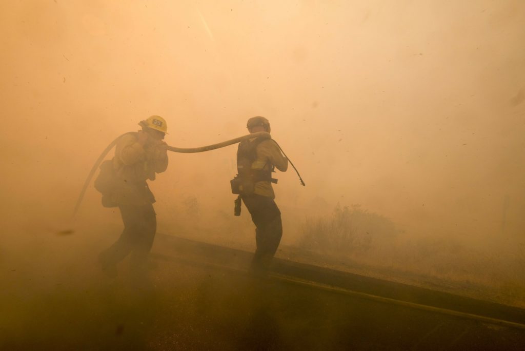 All told, more than 8,000 firefighters statewide were battling wildfires that destroyed more than 7,000 structures and scorched more than 325 square miles (840 square kilometers), the flames feeding on dry brush and driven by blowtorch winds.