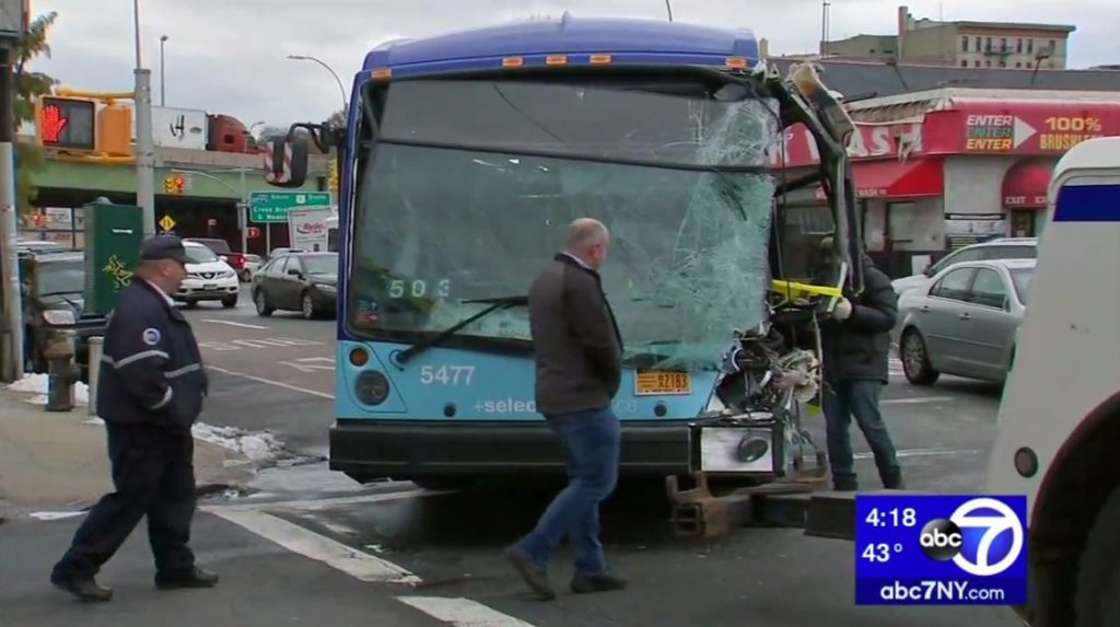 Authorities say the Fire Department vehicle was responding to a medical emergency in the borough’s Tremont neighborhood around noon when it turned into the path of the bus. The impact shattered the window by the driver’s seat, sending debris flying onto the road.
