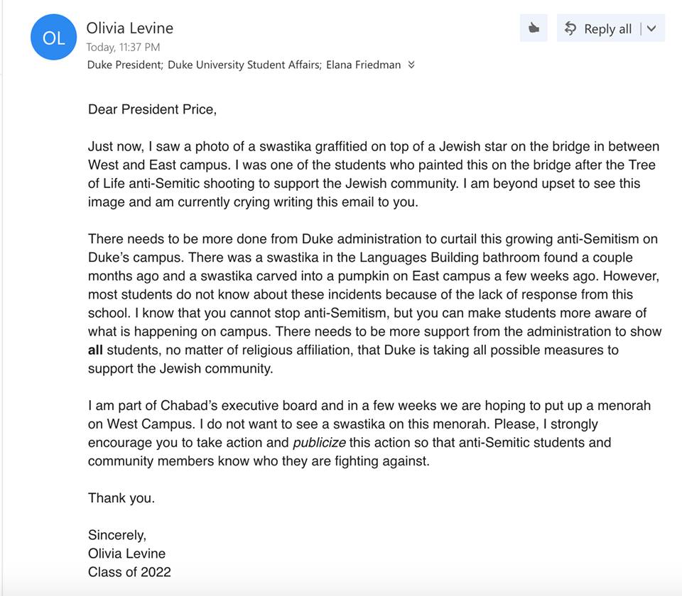 Duke University officials say someone painted a Nazi symbol on a mural honoring victims of last month’s Pittsburgh synagogue massacre.