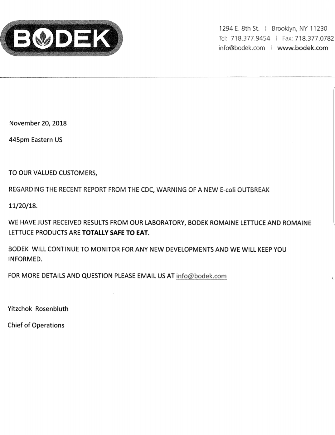 We have just received results from our laboratory, Bodek romaine lettuce and romaine lettuce products are totally safe to eat.