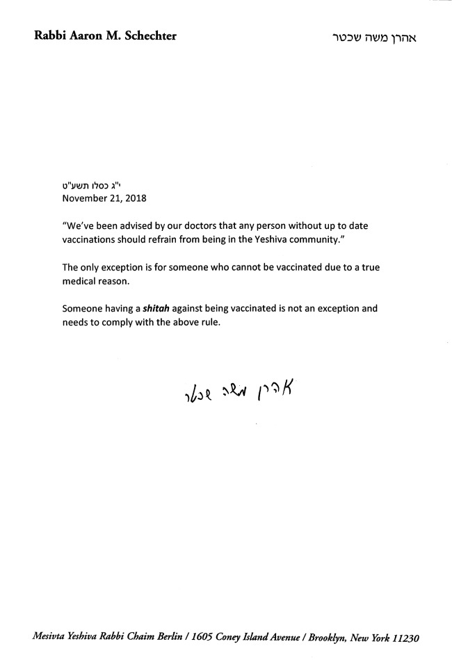 The Rosh Yeshiva of Chaim Berlin, HaRav Aharon Schecter has released a letter to the parent body regarding the need to vaccinate.