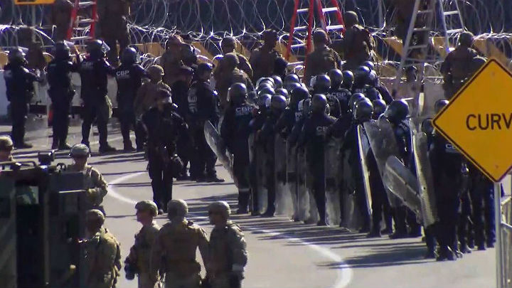 U.S. Border Patrol helicopters flew overhead, while U.S. agents held vigil on foot beyond the wire fence in California. The Border Patrol office in San Diego said via Twitter that pedestrian crossings have been suspended at the San Ysidro port of entry at both the East and West facilities.