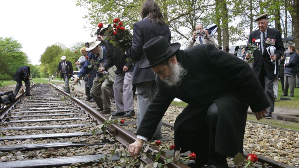 In this Monday May 9, 2015, file photo, a Rabbi puts a rose on the railroad tracks at former concentration camp Westerbork, the Netherlands, remembering more than a hundred thousand Jews who were transported from Westerbork to Nazi death camps. The Dutch national railway company NS says it will set up a commission to investigate how it can pay individual reparations for its role in mass deportations of Jews by Nazi occupiers during World War II. (AP Photo/Peter Dejong)