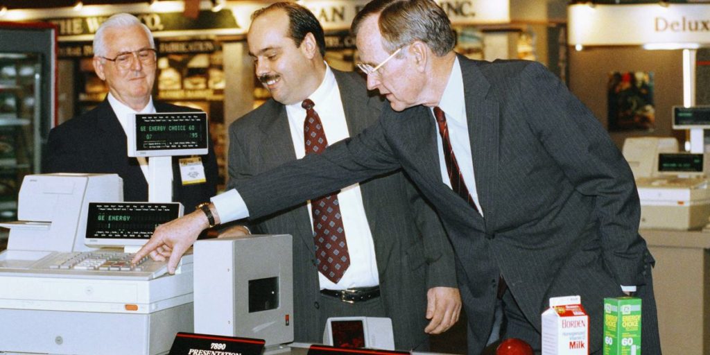 But although Bush had remarked that some of the machine’s features seemed “amazing,” it hardly looked like his first time in a supermarket checkout line. Mostly, Bush seemed to be politely listening to National Cash Register executives making their pitch.