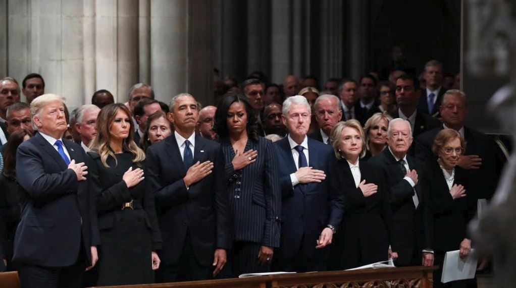 The congregation at the cathedral, filled with foreign leaders and diplomats, Americans of high office and others touched by Bush’s life, rose for the arrival of the casket, accompanied by clergy of faiths from around the world. In their row together, President Donald Trump and former Presidents Barack Obama, Jimmy Carter and Bill Clinton stood with their spouses and all placed their hands over their hearts.