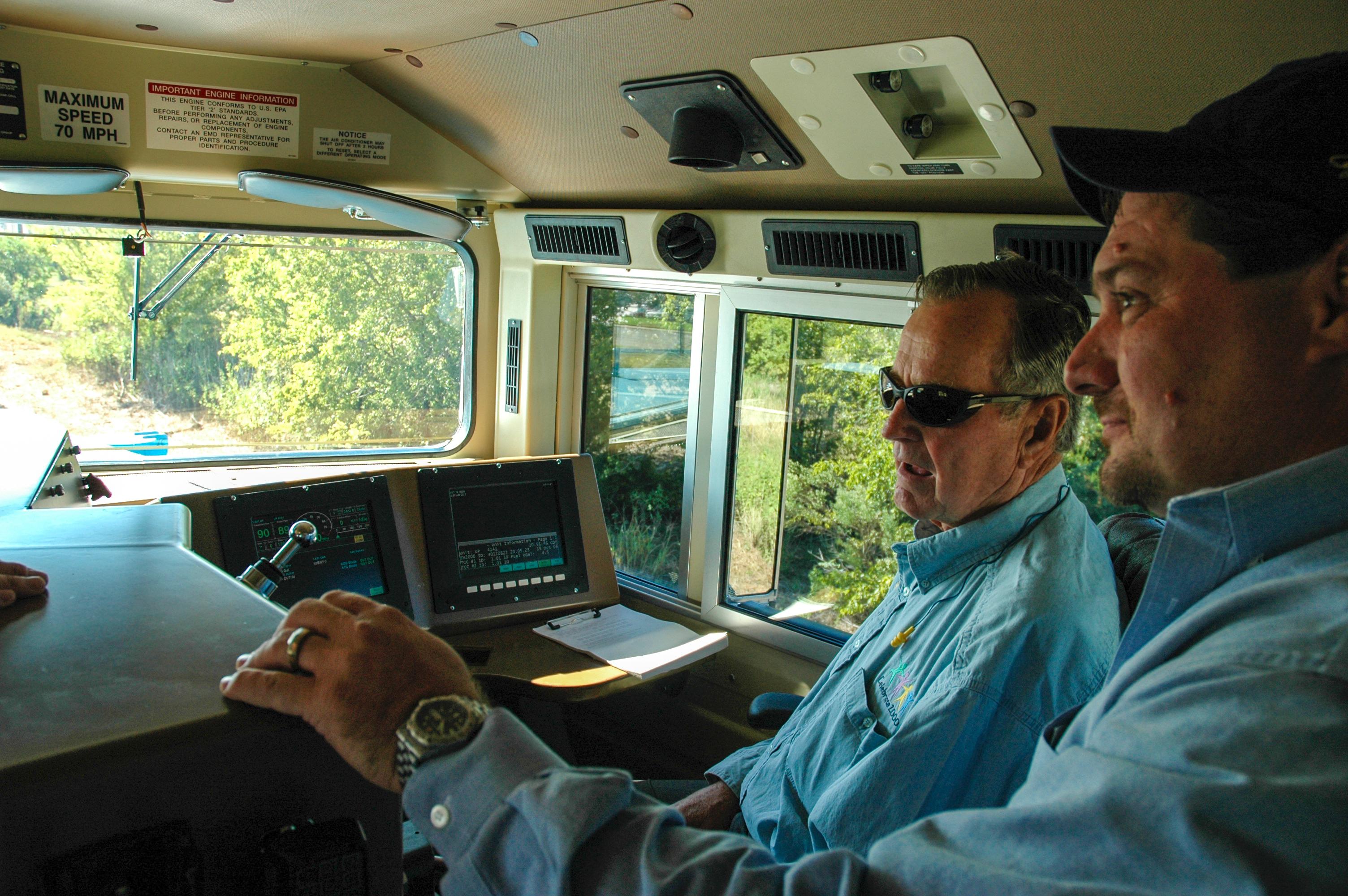 Union Pacific originally commissioned the Bush locomotive for the opening of an exhibit at his presidential library titled “Trains: Tracks of the Iron Horse.” It was one of the few times the company has painted a locomotive any color other than its traditional yellow. After a brief training session during 4141’s unveiling 13 years ago, Bush took the engineer’s seat and helped take the locomotive for a 2-mile excursion.