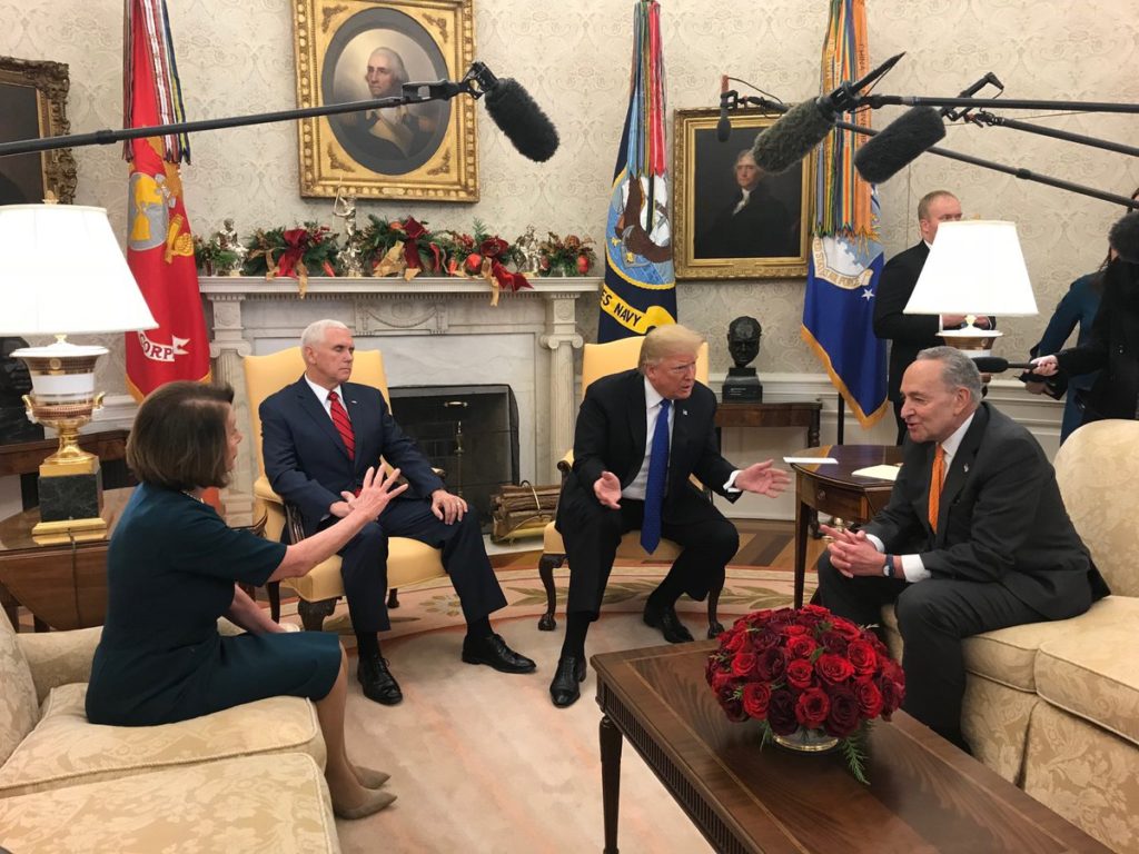 Trump and House and Senate Democratic leaders Nancy Pelosi and Chuck Schumer squabbled for more than 15 minutes in the stunning, televised encounter. Each of them, especially Trump, interrupted the others to question facts, quibble over election results and lob insults.