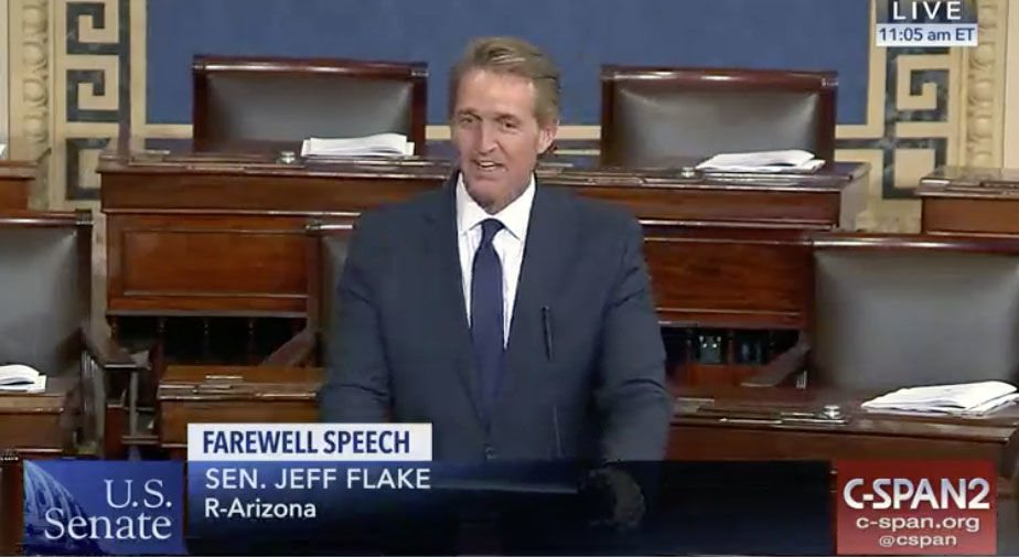 “Let us recognize as authoritarianism reasserts itself in country after country that we are by no means immune,” Flake said.