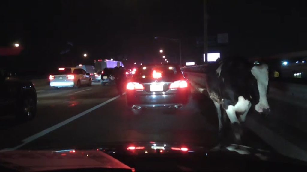 The animal was on its way to a slaughterhouse when it made its break for freedom, jumping off the top of a double-decker transport truck eight feet down onto the highway.