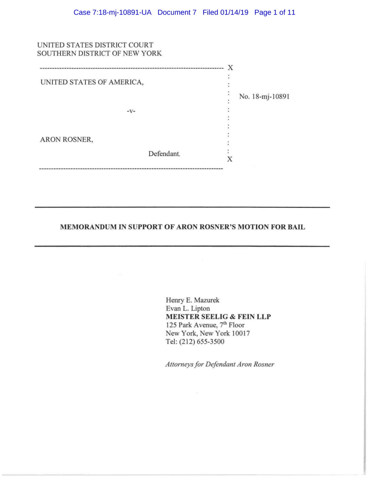 According to court documents provided to YWN, attorneys for Aron Rosner, Henry E. Mazurek and Eval L. Lipton filed a motion on Monday January 14 to have Rosner released on bail with the following conditions: