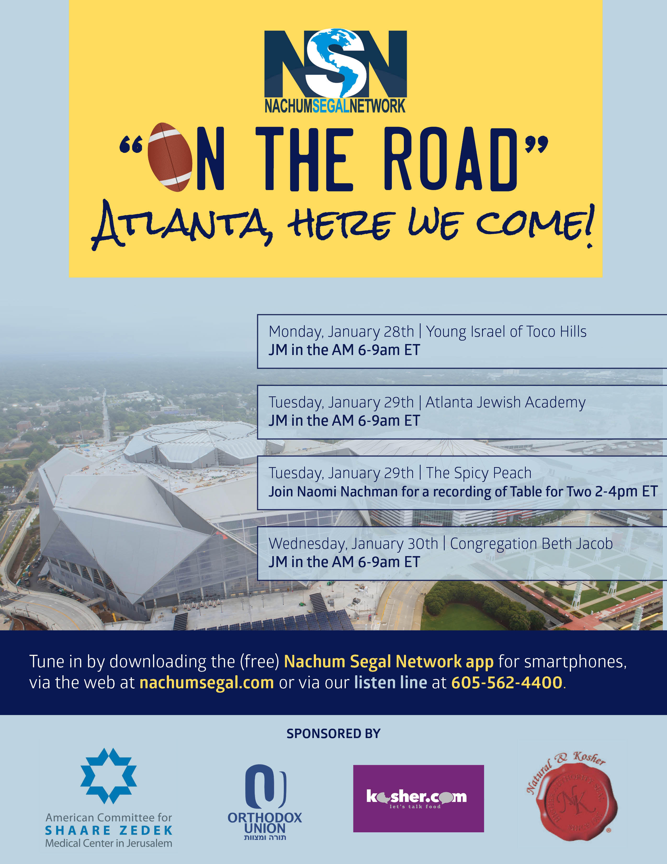 Top Jewish radio personality Nachum Segal will be broadcasting live from Atlanta during the week of January 28th and will be recording the network’s acclaimed Super Bowl “Kosher Halftime Show” while there. Many local Jewish community leaders and institutions will be featured on its programming throughout the week including several other Jewish communities throughout the South.
