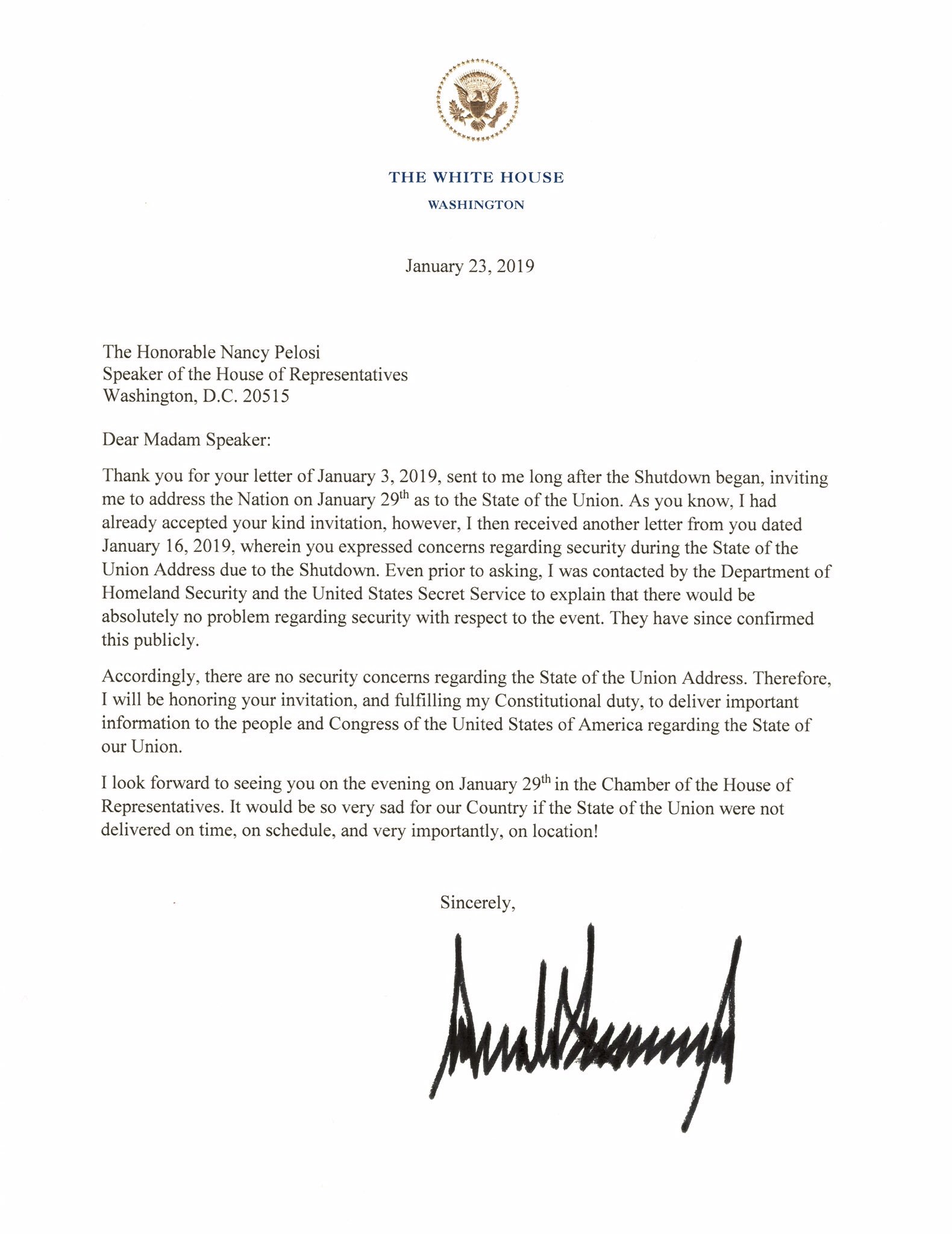 “It would be so very sad for our Country if the State of the Union were not delivered on time, on schedule, and very importantly, on location,” he wrote.