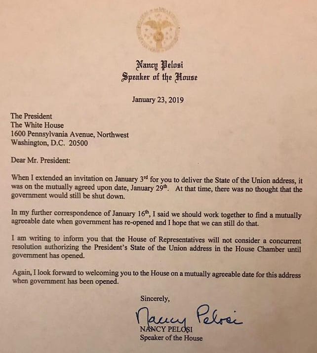 Pelosi quickly squelched the speech, writing back that the House “will not consider a concurrent resolution authorizing the President’s State of the Union address in the House Chamber until government has opened.”