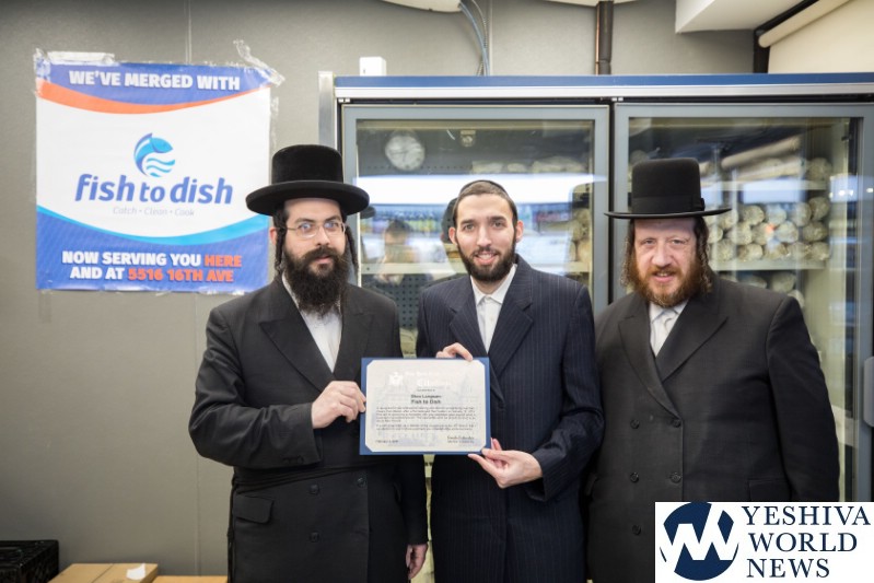 On Sunday, February 3, Assembly Member Simcha Eichenstein presented an official citation to Mr. Shea Langsam, owner of Fish to Dish, to commend him for his kindness in welcoming a competitor, Yossi’s Fish Market, into his store following a fire that destroyed the building that housed Yossi’s Fish Market.