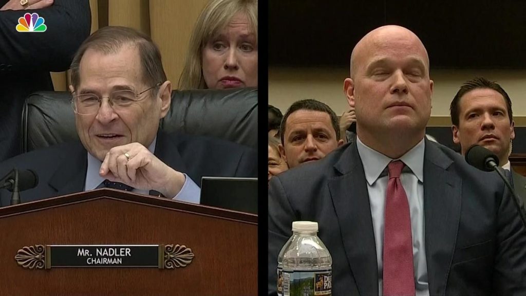 In a comment that drew audible gasps and chuckles, Whitaker interrupted questioning from the committee’s Democratic chairman, Rep. Jerrold Nadler, by saying, “Mr. Chairman, I see that your five minutes are up.” That referred to the time limits for questions — one normally addressed by lawmakers, not witnesses.