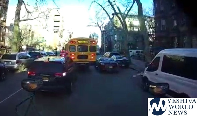 Watch how the bus turns on his red lights to pick up a young boy heading to Yeshiva, and a car speeds around the bus.
