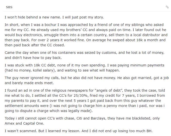 3. It seems these “schemes” are a total violation of the CC terms of service. This is gzeila from the CC companies, not to mention gneivas daas, dishonest business dealing, supporting potentially illegal operations that violate customs laws, and a violation of dina demalchusa. Telling people “don’t risk more than you can afford to lose” is essentially telling people to do these aveiras, as long as they can live with the financial consequences. When did financial gain become a heter to violate halacha? When did bitachon in the Ribono Shel Olam with an honest parnassah become insufficient, to the point where “Yeshiva World” can shamelessly post articles advocating for crookedness and assur behavior?