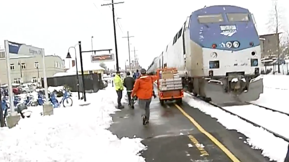 Rhodes said the train stopped suddenly but not violently. She was told the engine hit several snow-laden trees and that one snapped back, damaging a hose assembly providing air pressure for the brakes. The train was repaired enough to move forward a short distance to Oakridge, Oregon, a town 1,200 feet (366 meters) high in the Cascade Range that was dealing with its own problems — a blackout and snow and debris-covered roads.