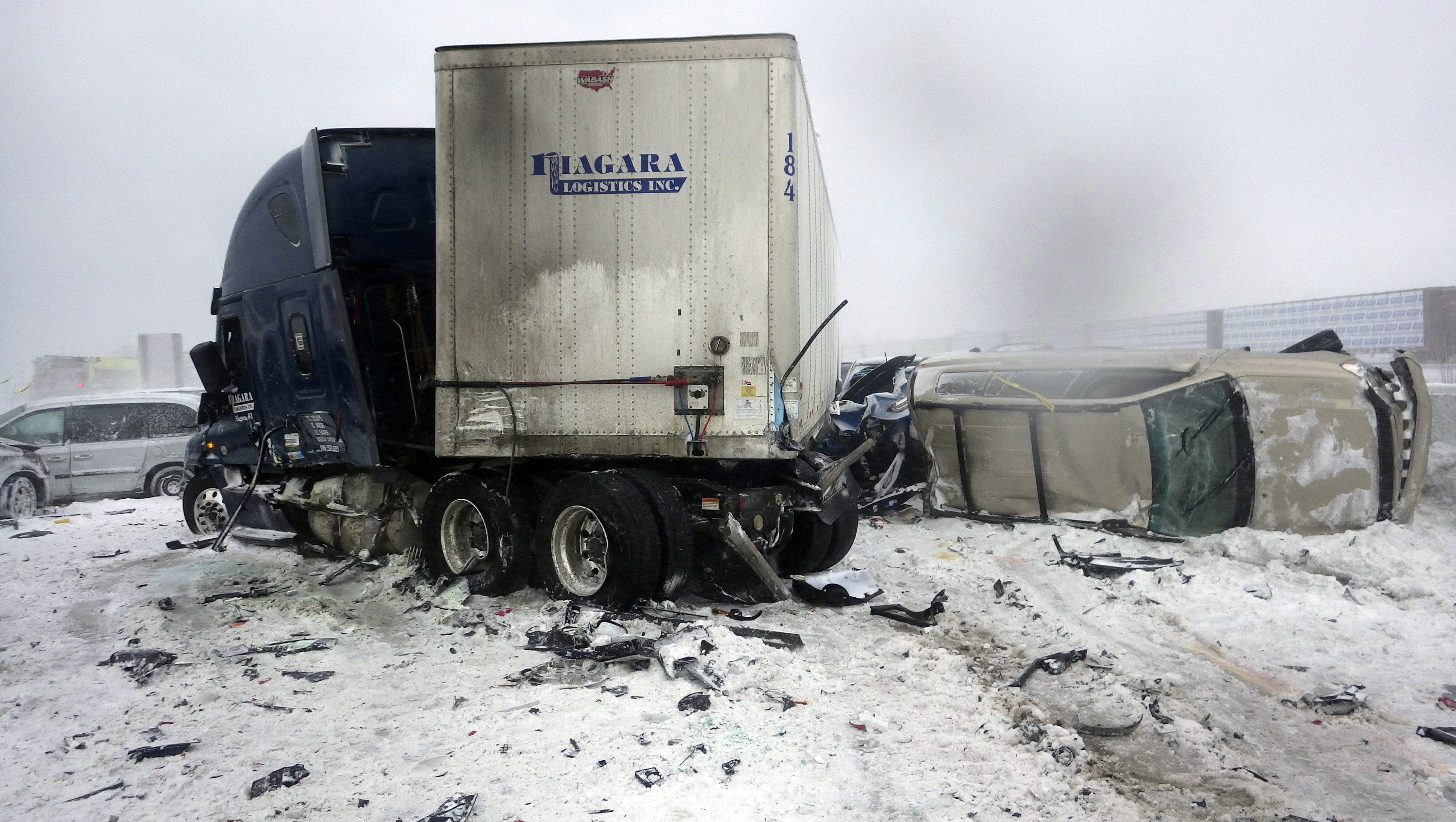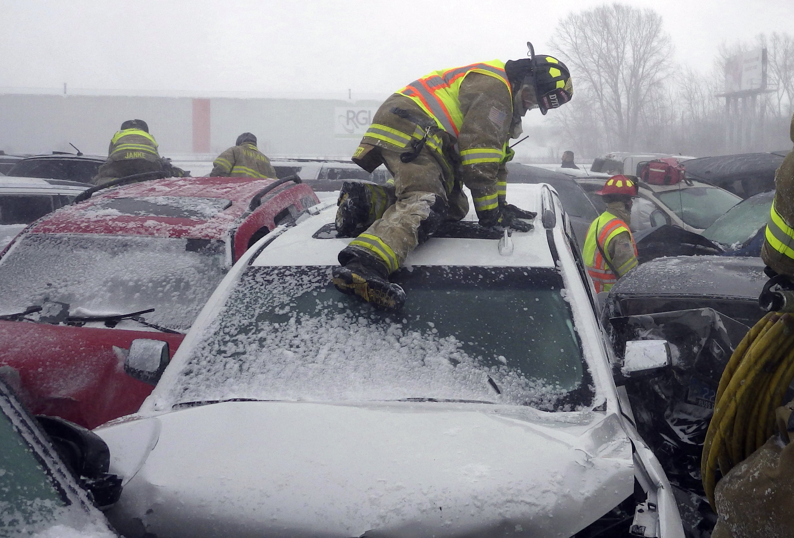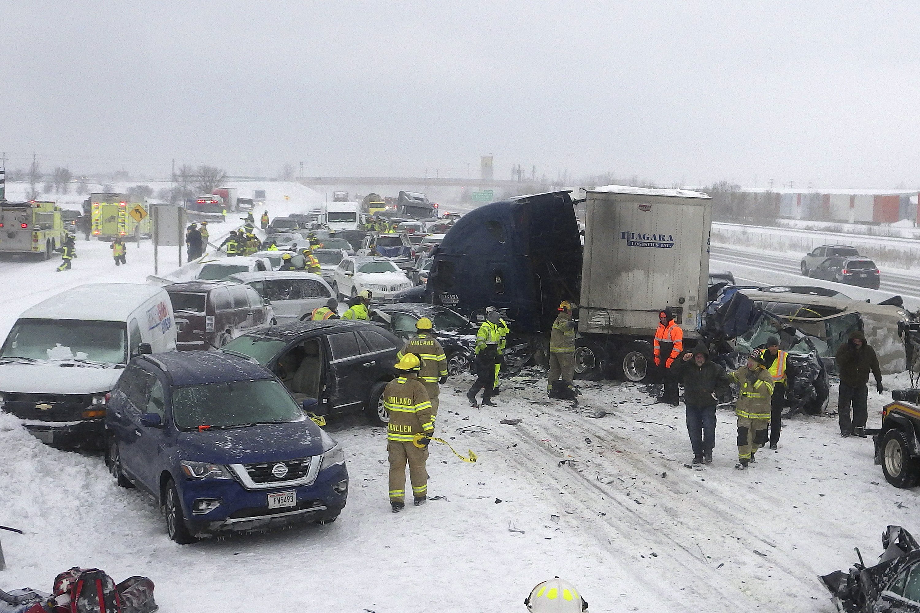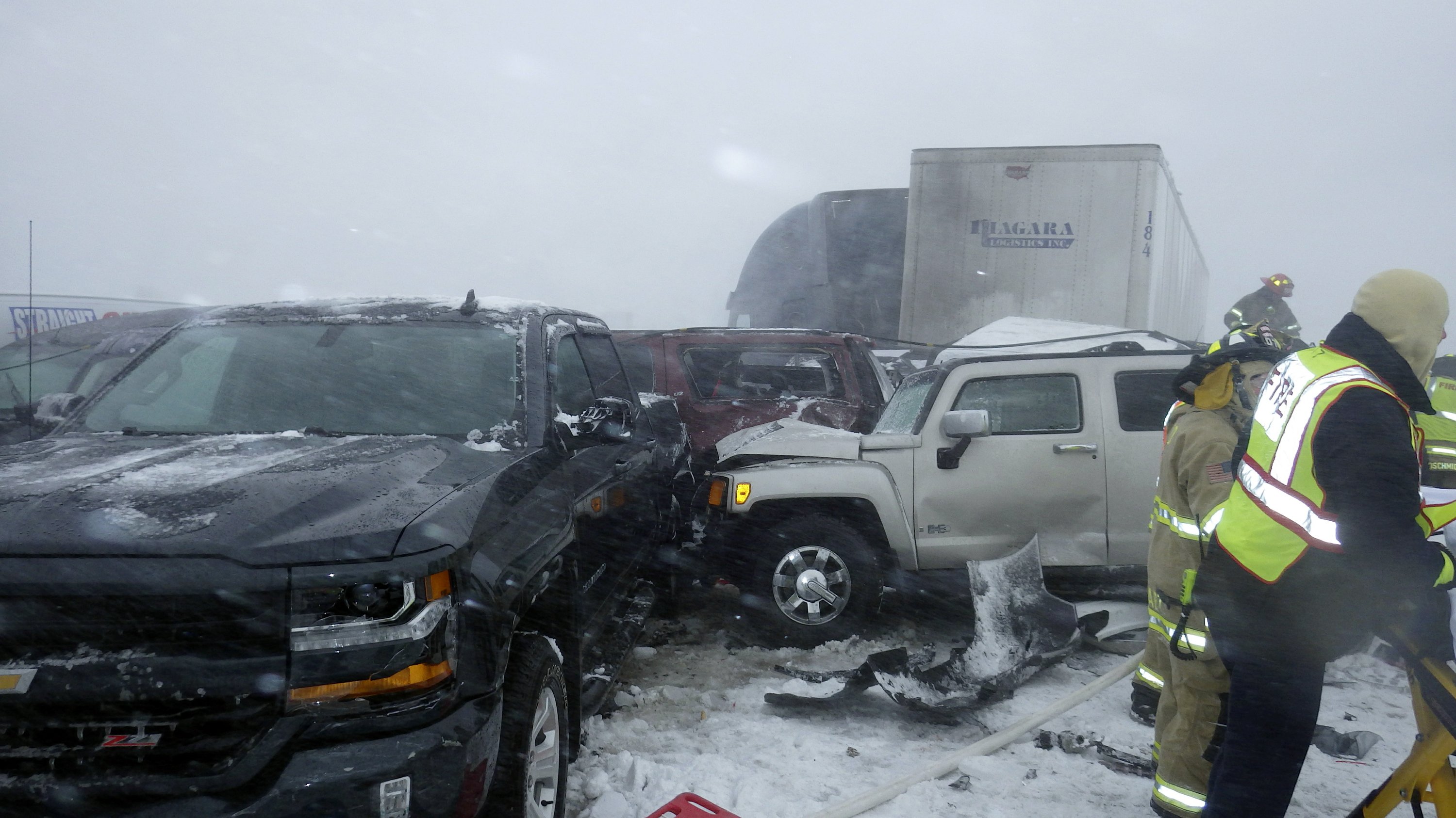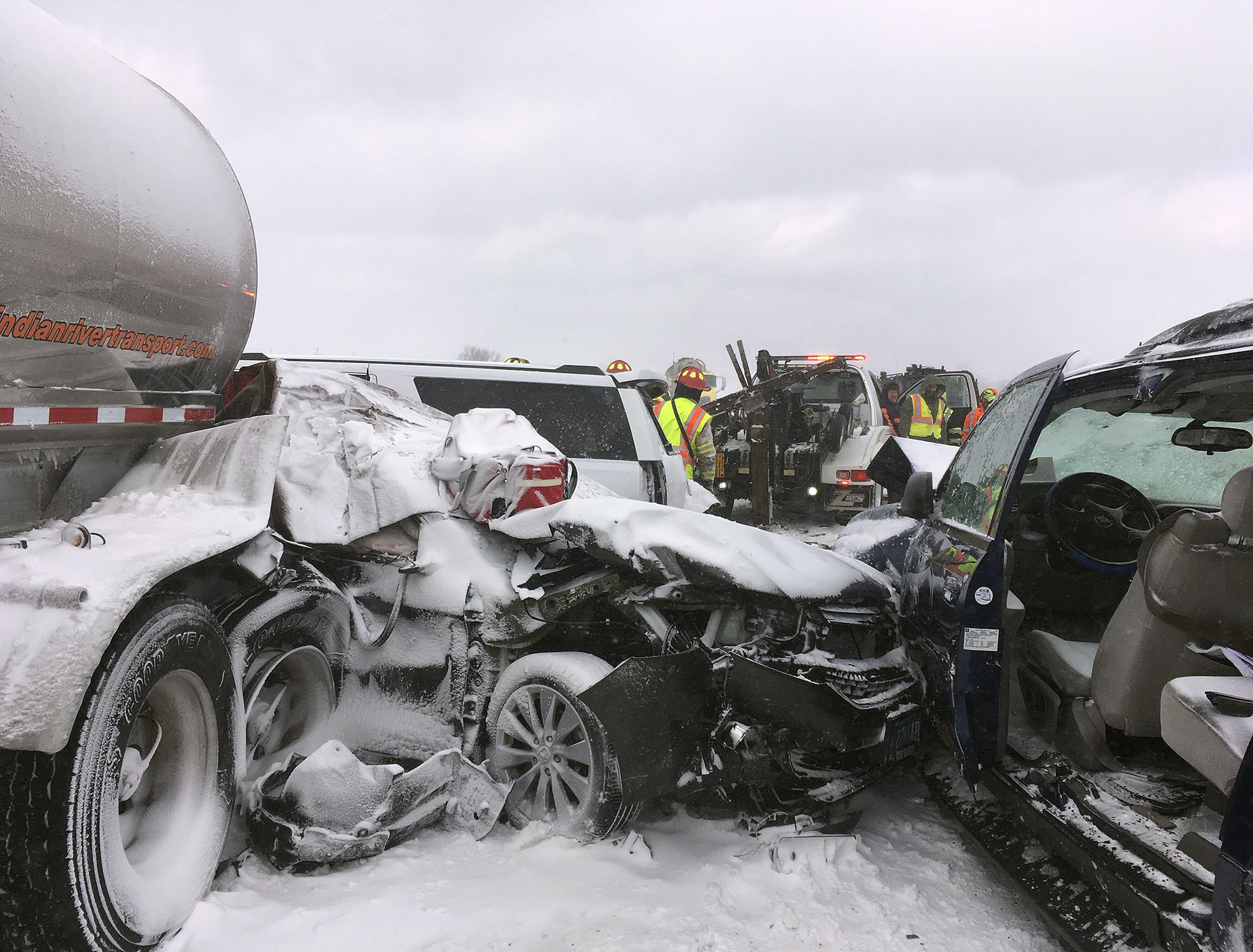 Photos released by the Winnebago County Sheriff’s Office show crumpled cars, pickups and semis smashed into one another on the snowy highway. In body cam video, a responding deputy crawls over the wreckage and yells to a trapped motorist to hold on.