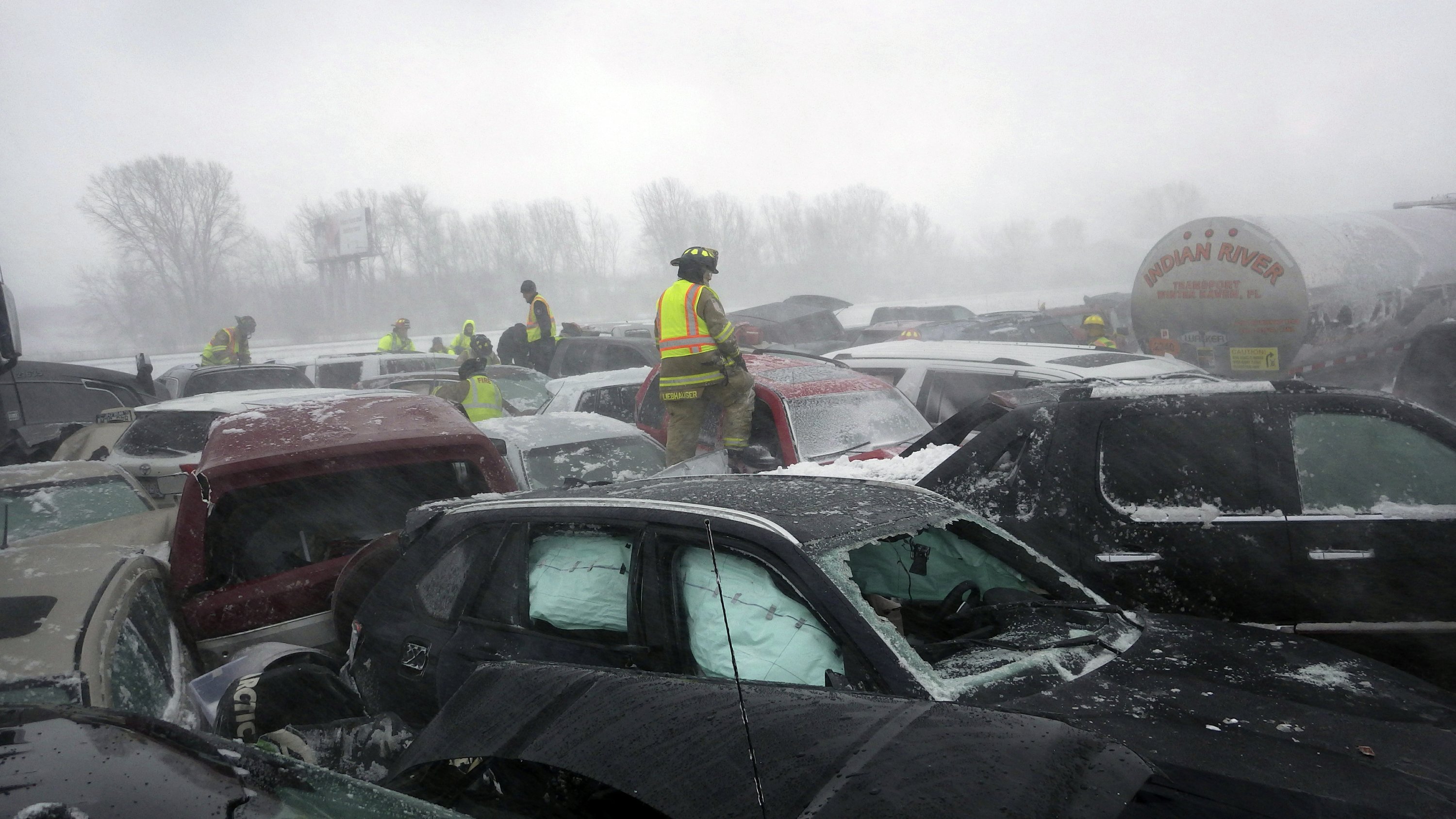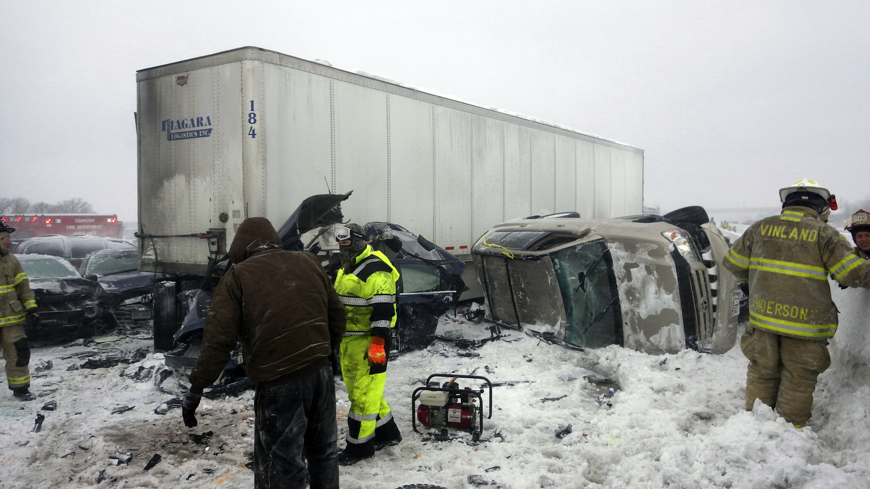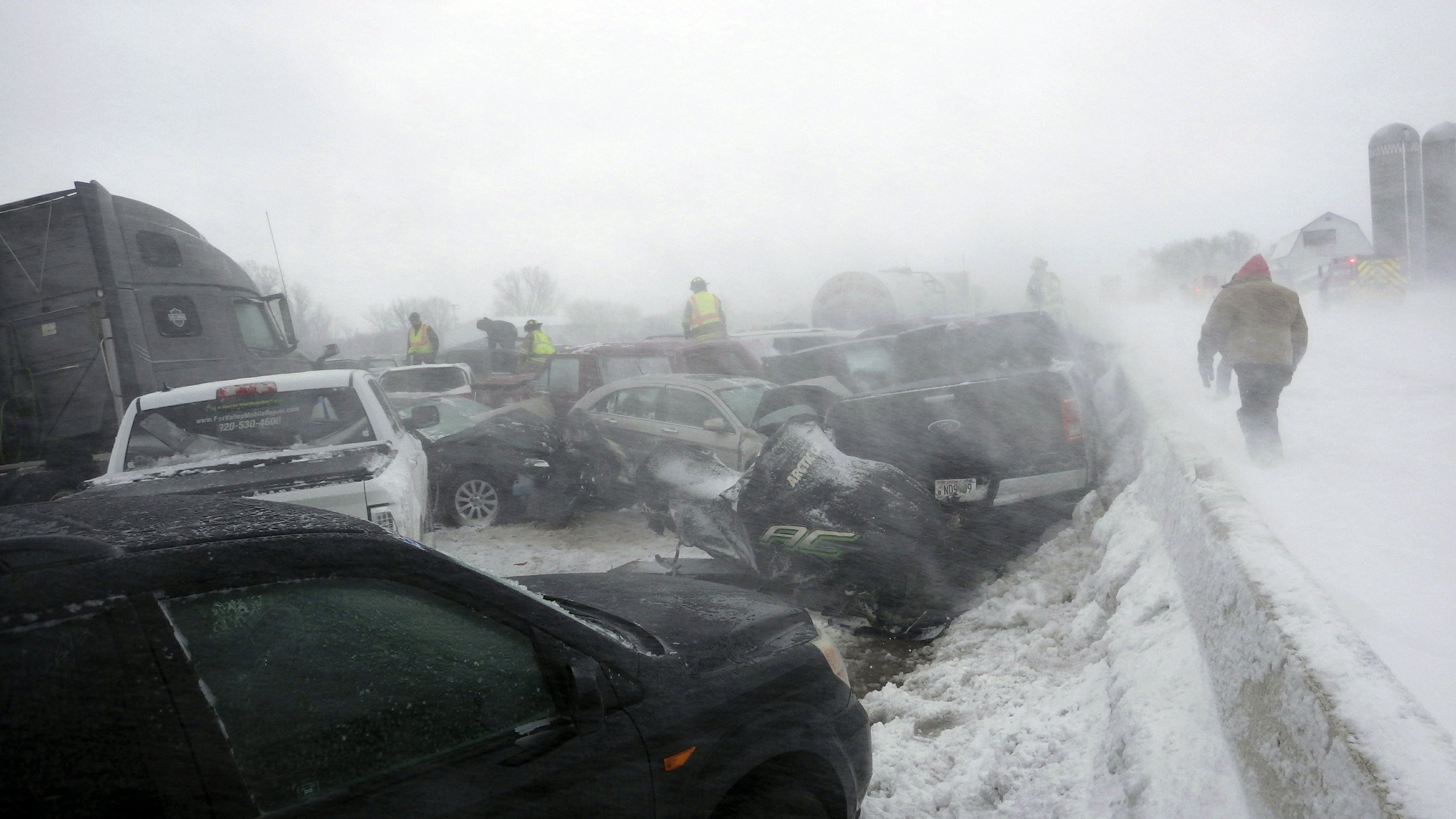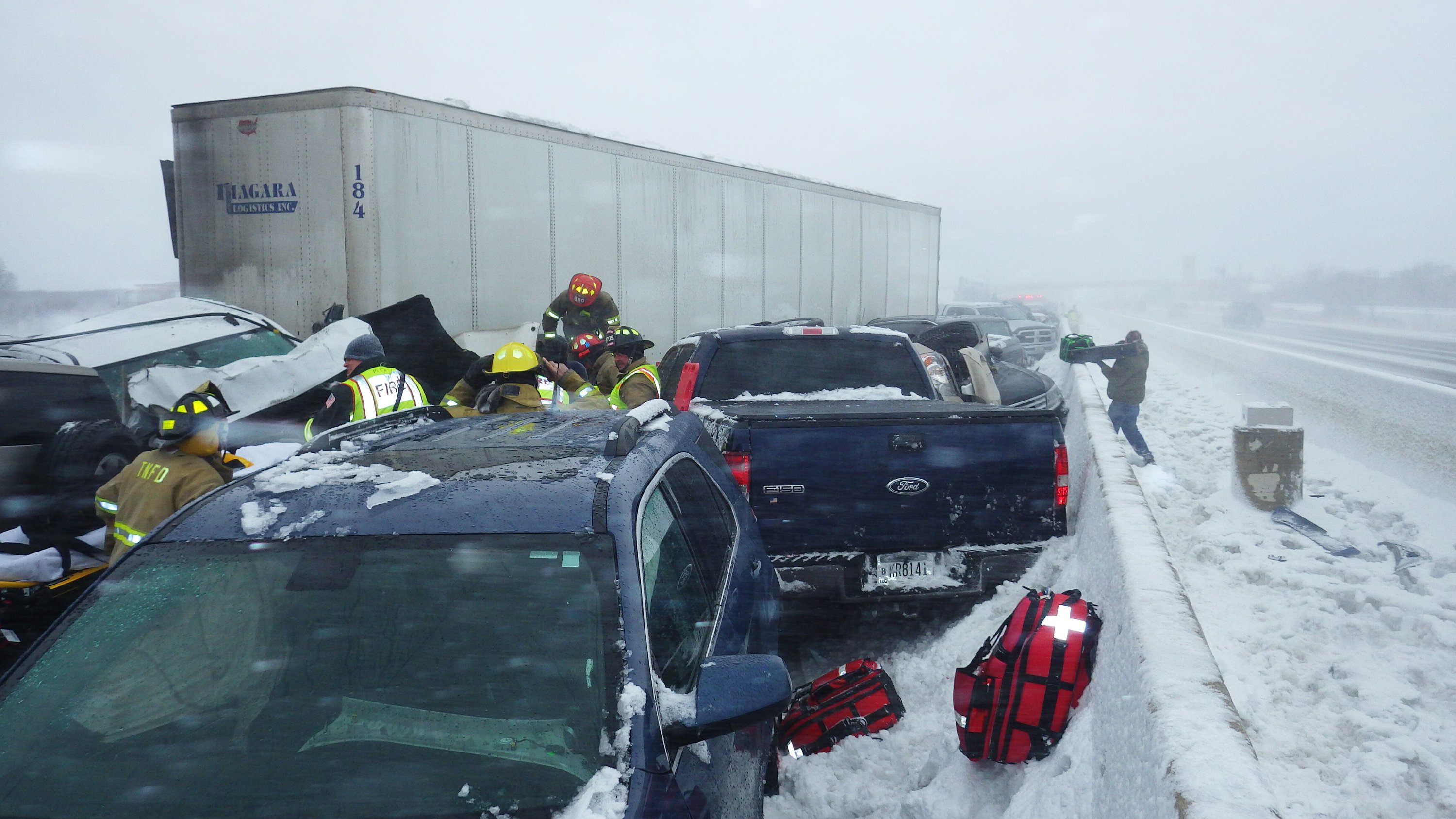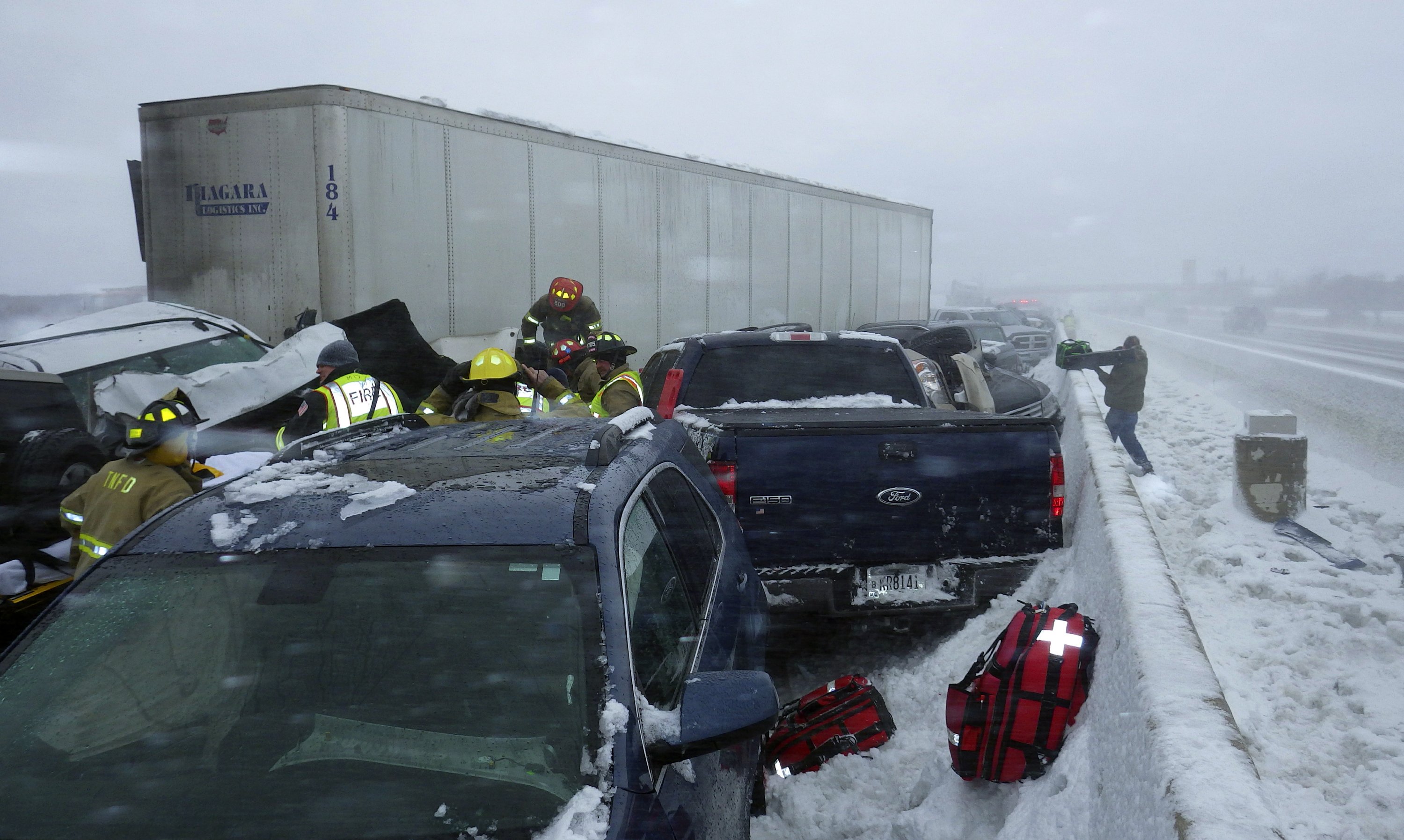 Photos released by the Winnebago County Sheriff’s Office show crumpled cars, pickups and semis smashed into one another on the snowy highway. In body cam video, a responding deputy crawls over the wreckage and yells to a trapped motorist to hold on.