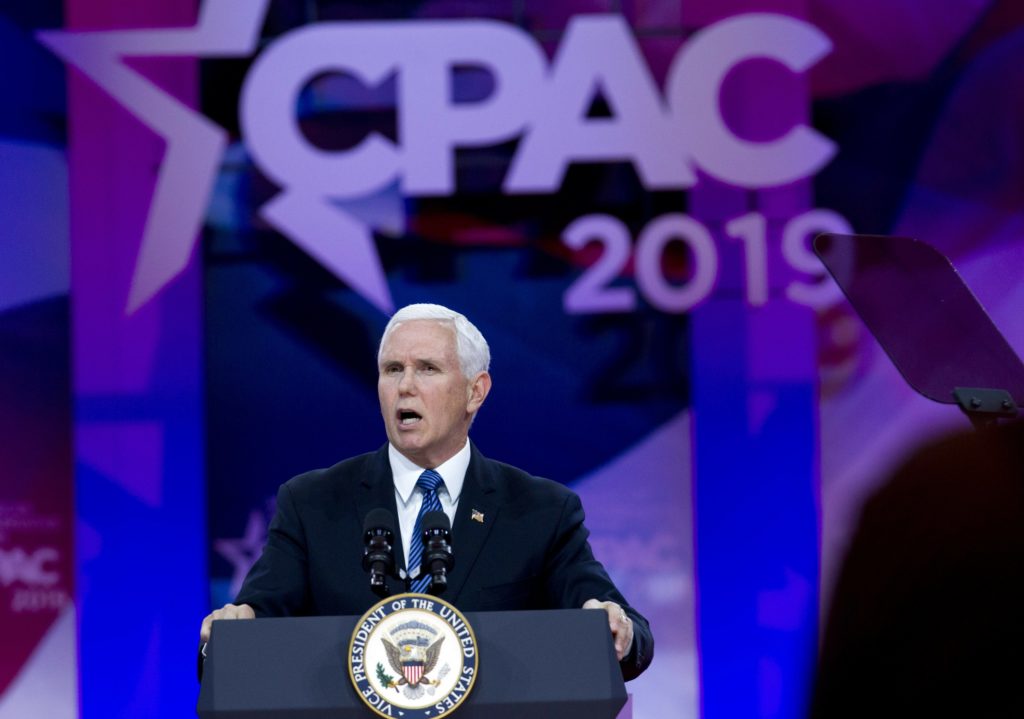 Trying to portray Democrats as out of step with ordinary Americans, Vice President Mike Pence said in a speech Friday at the Conservative Political Action Conference that the choice in the next election is “between freedom and socialism, between personal responsibility and government dependence.”