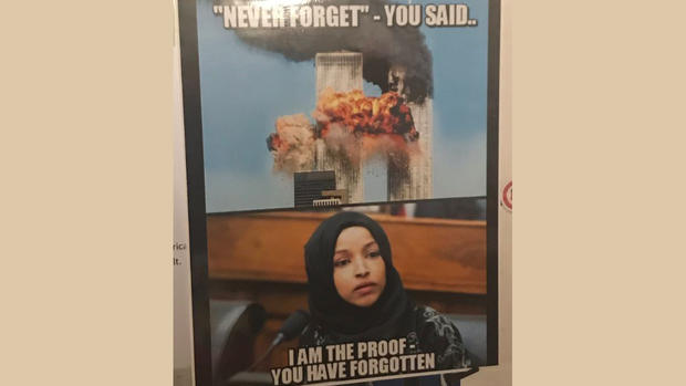 The poster is very appropriate. Ilhan Omar, ISIS, AlQeda and Hamas share the same end goals to impose sharia law on rest of the world and and establish caliphate , they all belong to the same umbrella organization called Muslim Brotherhood. Just last week she shared fundraising events with Hamas supporters.