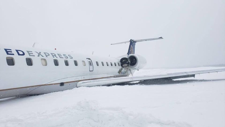 Images from the scene showed the jet in deep snow at the Presque Isle Regional Airport. Part of the landing gear was torn away and the nose cone was damaged.