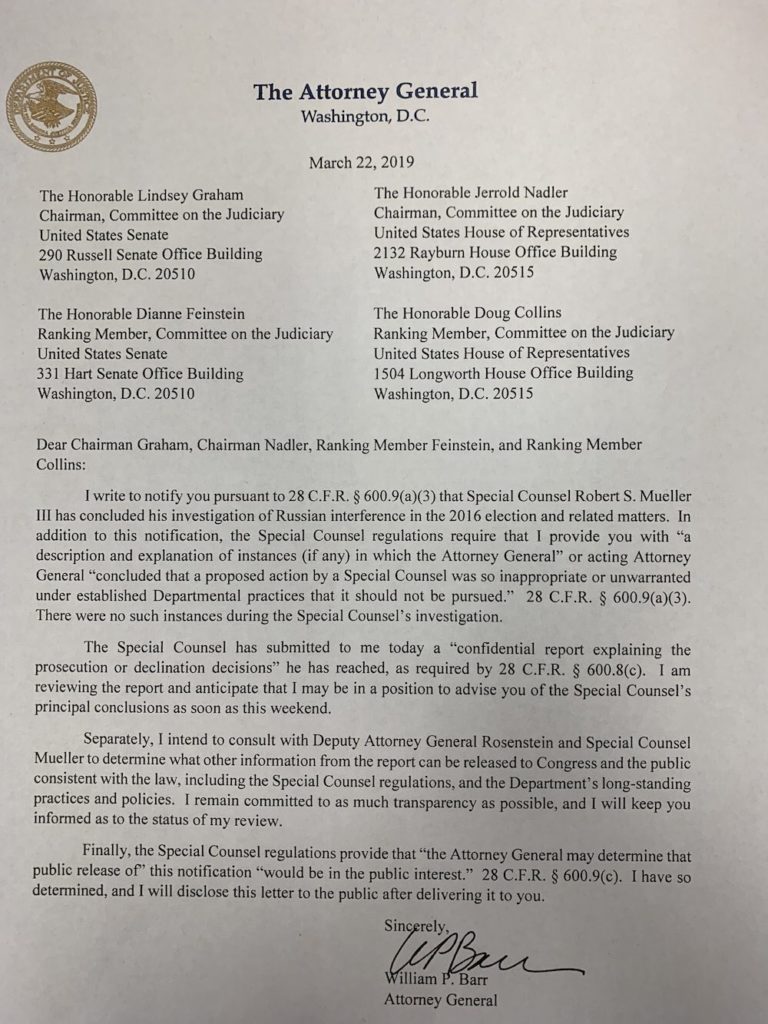 “I am reviewing the report and anticipate that I may be in a position to advise you of the special counsel’s principal conclusions as soon as this weekend,” Barr said in his letter the top Republicans and Democrats on the House and Senate Judiciary committees. He pledged a commitment to transparency.