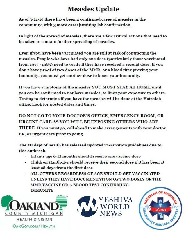 Michigan health officials have confirmed to YWN that there are around 15 confirmed cases of measles in the Detroit area since March 13. Most of the cases are adults.