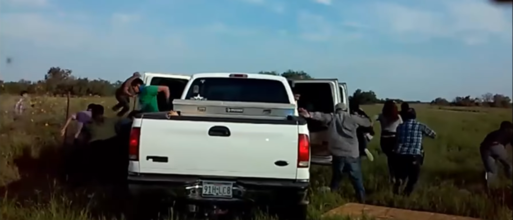 The truck then stops and about 20 people jump out, some from the passenger area and others from under a cover on the bed of the truck. Many were illegal immigrants.