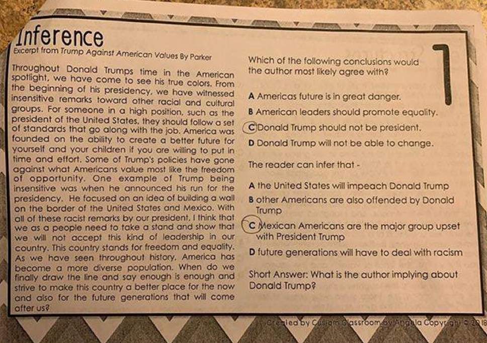 A Houston-area school district says one of its teachers used poor judgment when she had her students read an essay critical of President Donald Trump.
