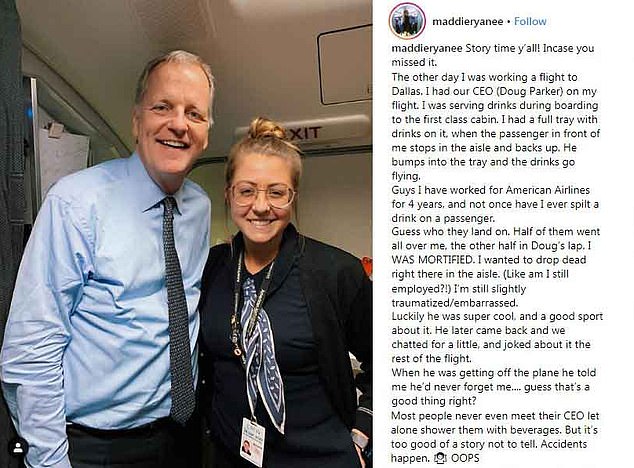 An American Airlines flight attendant says she was mortified when a passenger accidentally bumped her and she dropped a tray of drinks on her boss — CEO Doug Parker.