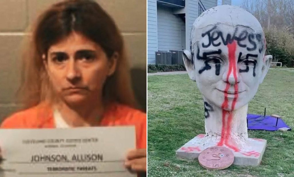 Allison Christine Johnson, 45, of Norman, was charged in Cleveland County with one felony and three misdemeanor counts of malicious injury to property and one misdemeanor count of malicious intimidation or harassment, according to court records. Records indicate she is being held on $25,000 bond but do not indicate if she has an attorney who could speak on her behalf.