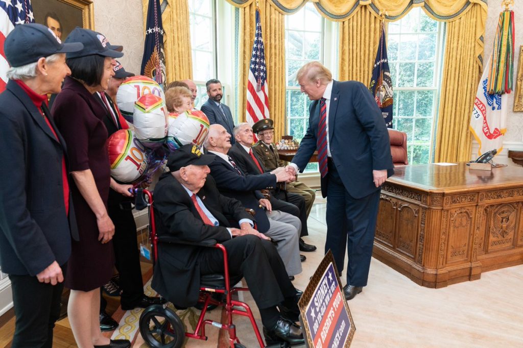 President Donald Trump treated four World War II veterans to an Oval Office meeting Thursday, fulfilling a birthday wish for 95-year-old Allen Jones and giving three other veterans age 100 and older a day to remember.