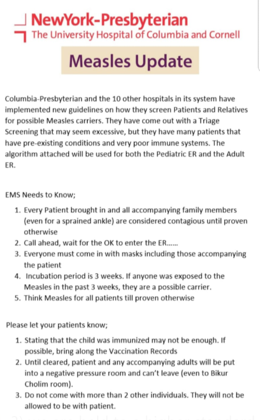 This is an outrage. My son is a Medical Resident at Mt Sinai. He informs me that there is actually an outbreak of Tuberculosis and Cholera among recent undocumented Immigrants who arrive at ER. Yet there is no media coverage of this dangerous outbreak of these deadly diseases, and there is no triage done to this Unvaccinated group for any disease- not Measles, not TB, not cholera, not of them nor their family members upon arrival at the ER. Jews in NYC have allowed themselves to be targeted as an infectious group of a deadly disease. Actually, there have been no fatalities in NYC in the Jewish community due to Measles. By Stopping Hatzalah Ambulances and wasting time in Emergencies triaging for measles, the City is putting Jews lives at far more risk than the very few cases of measles.