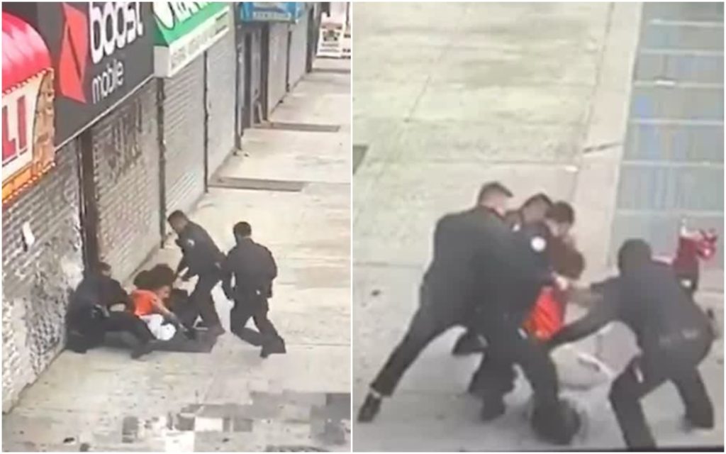 At one point, an officer is seen pulling out a yellow Taser and all four officers struggle trying to restrain the man as he writhes and flails on the sidewalk.