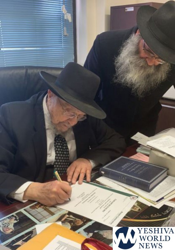 After the sale, Rabbis Weinfeld and Sternberg came to the office of Hagaon HaRav Dovid Feinstein. Rav Feinstein supported the sale last year and guided Rabbi Weinfeld with this year’s. He expressed his pleasure at the sale of the chametz and added his signature with the words: