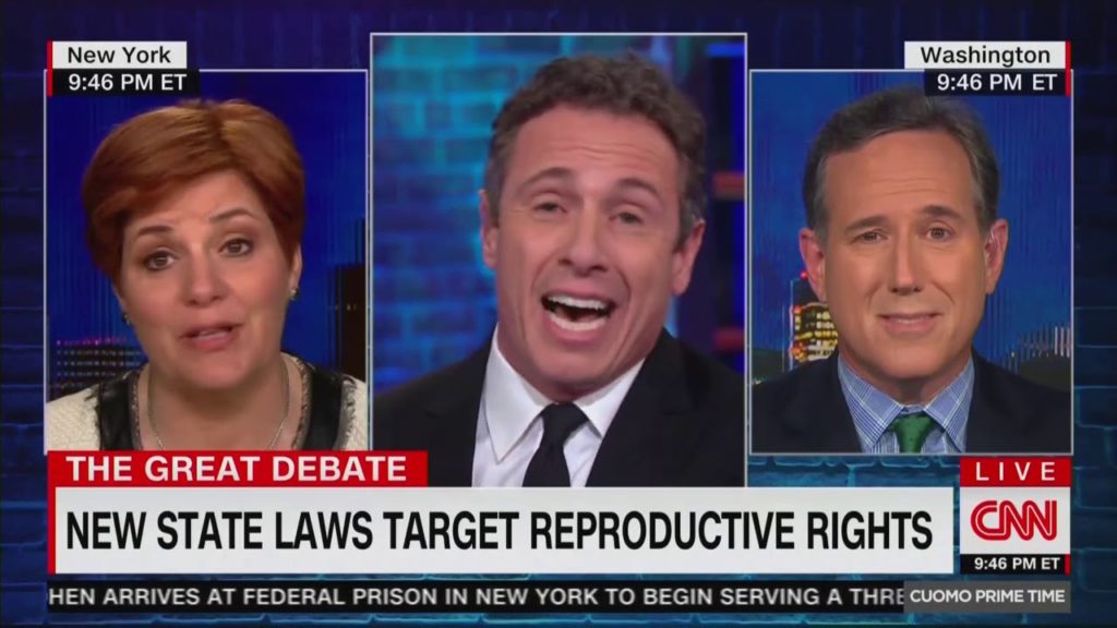 When Santorum asked Cuomo if he disagreed “that at the moment of conception that a child is human and alive?” Cuomo replied that means it’s “viable.” When Santorum asked, “Is it biologically a human life?” Quinn shouted, “No!”