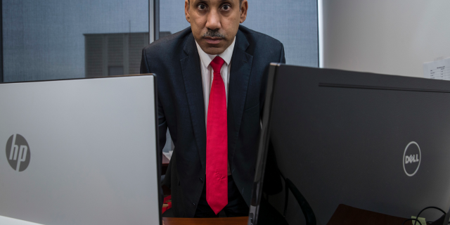 In this Oct. 26, 2018, file photo Ali AlAhmed poses for a photograph in his office in Washington. Citizen Lab says a fake Twitter account unmasked by The Associated Press was but one piece of a vast years-old and multi-lingual campaign aimed at seeding anti-Saudi, anti-Israel and anti-American stories across the internet. The Associated Press was on the verge of publishing a story about how AlAhmed, who is based in the Washington area, had been targeted by hackers posing as a female journalist. (AP Photo/Alex Brandon, File)