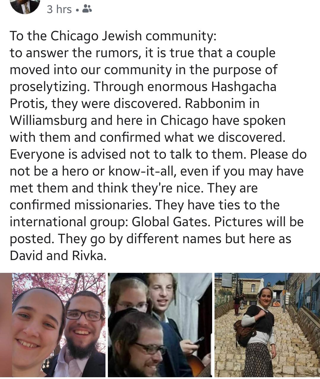 This is sick and disgusting but part of the usual deceptive practices of these idolators.But the Chicago community needs take responsibility and track where these imposters go next, and warn the next community!You need to take clear pictures of these people and publish it on every Frum web site so people know.