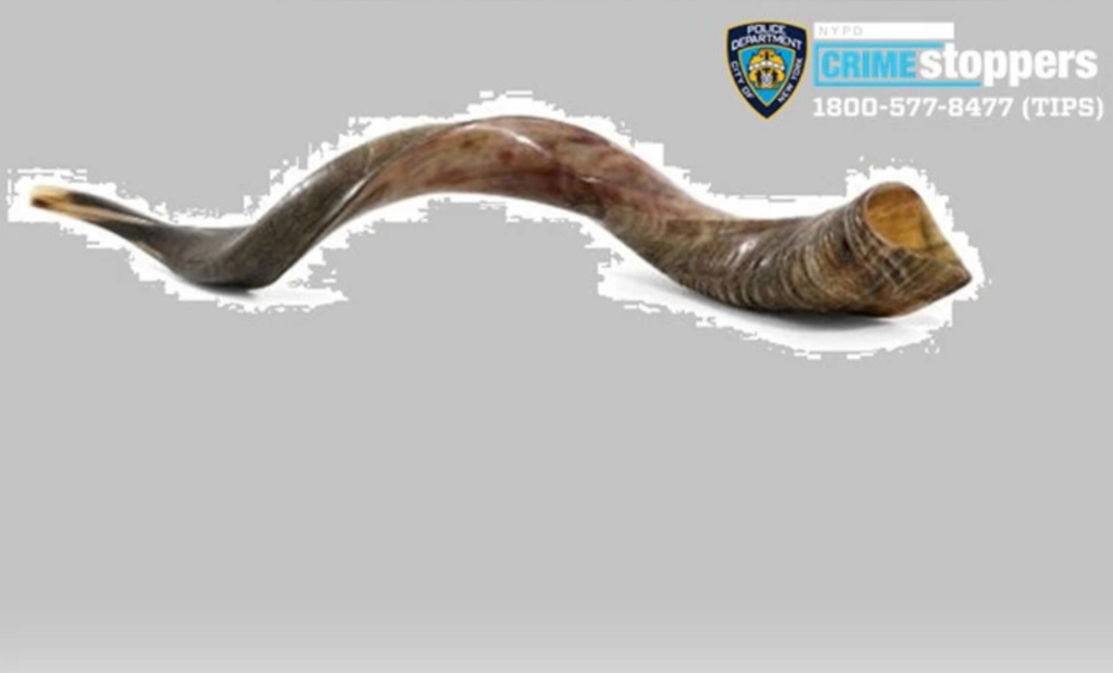 The NYPD has put out a photo of a polished Yemenite Shofar similar to the ones stolen from the victim – and is asking anyone with information about the theft to call the department’s Crime Stoppers hotline at 1-800-577-8477.
