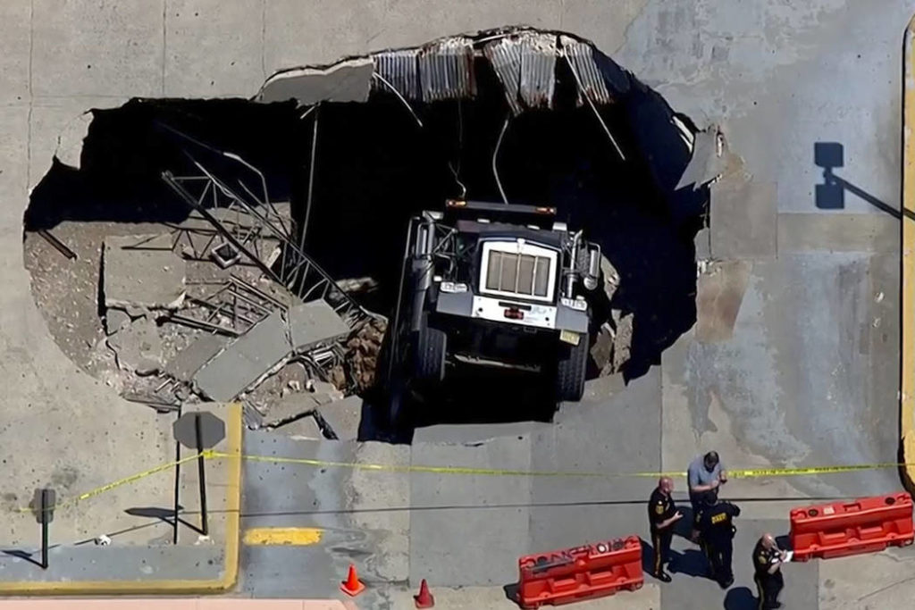 Video showed a large hole where the collapse occurred. The front end of the truck was seen in the hole, which had been cordoned off.