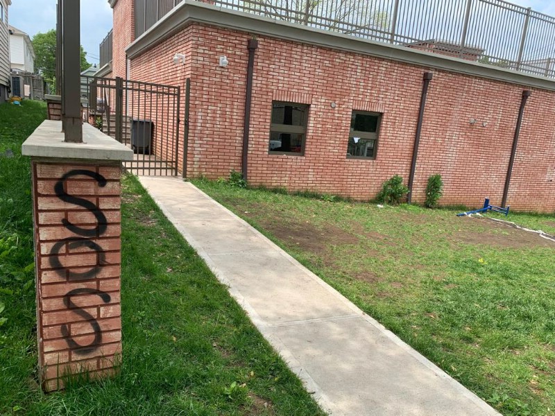 Across the street, the letters “SOS” were written with spray paint on the Yeshiva Zichron Paltiel of Staten Island.